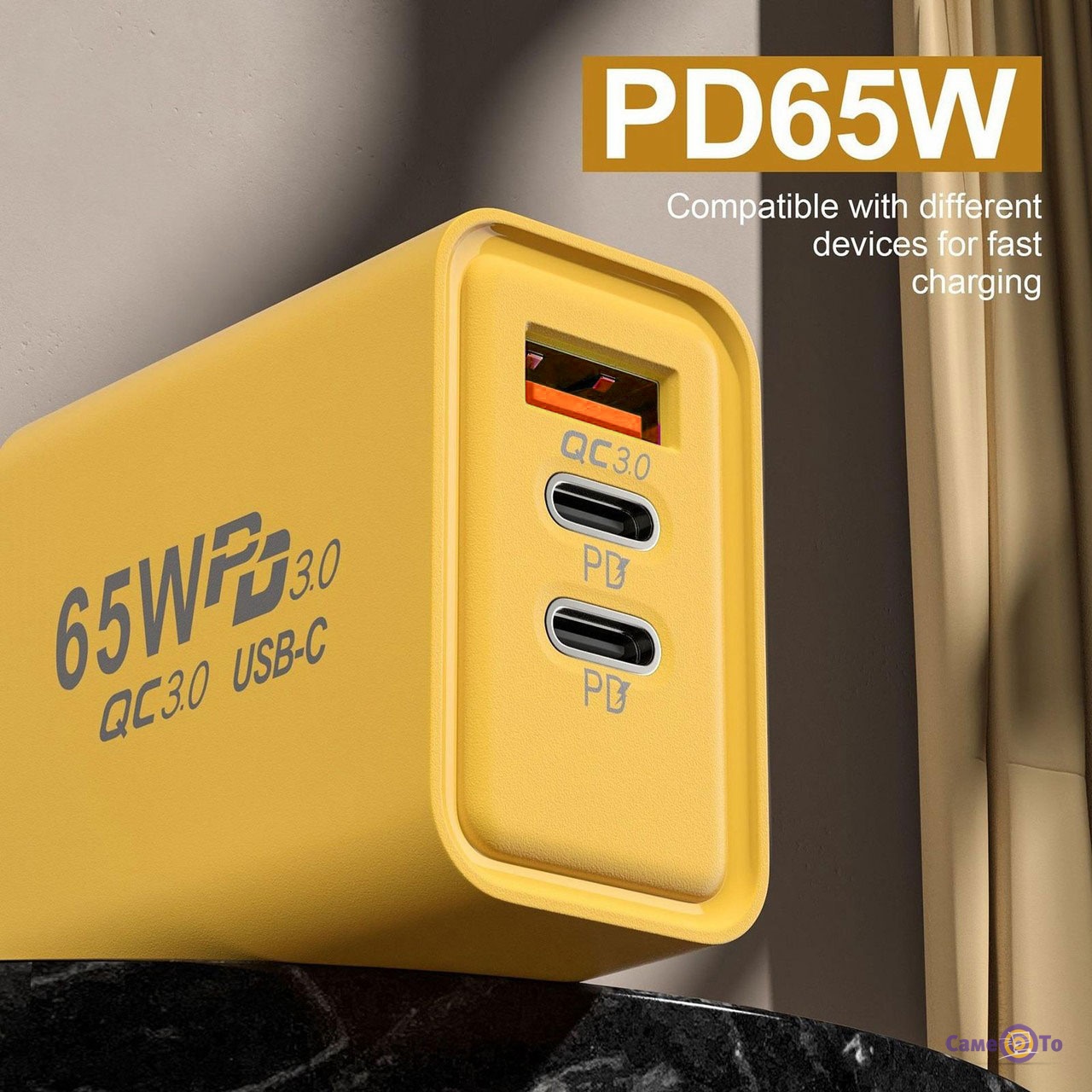 Цей жовтий адаптер оснащений USB та 2 роз’ємами Type-C, забезпечуючи високу потужність 65 Вт для швидкої зарядки. Це зручний мережевий зарядний пристрій сумісний із багатьма смартфонами та іншими пристроями. Ідеально підходить для використання вдома, в офісі або в поїздках. Дозволяє заряджати телефон у будь-який час, забезпечуючи надійне та стабільне живлення. Пристрій компактний, легкий і простий у використанні, підходить для зарядки як ваших пристроїв, так і пристроїв ваших друзів чи сім’ї.