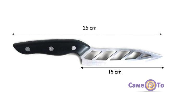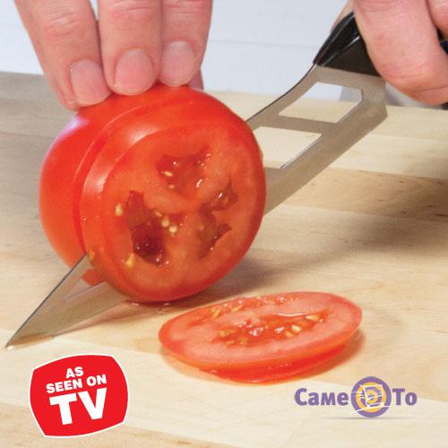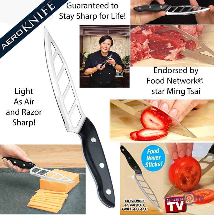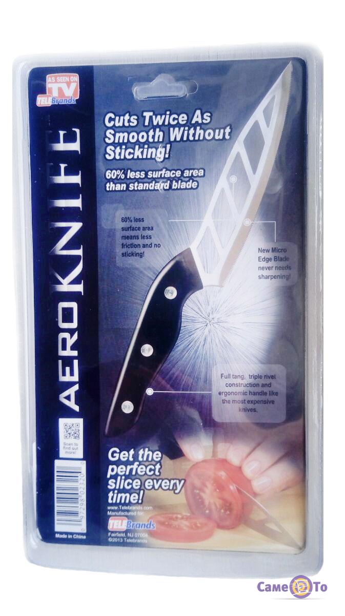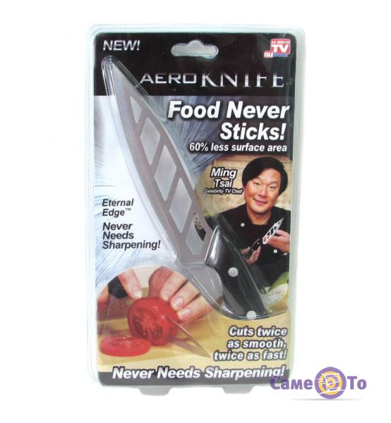 Ніж Aeroknife має іншу поверхню леза, яка більше ніж в половину менша, ніж у стандартних ножів. А все завдяки тому, що на лезі є спеціальні отвори, розташовані уздовж всієї його довжини. Це величезний плюс, адже така структура леза не дозволяє їжі прилипати до нього під час різання, і скибочки продуктів виходять рівними і однаковими за лічені секунди. Аероніж має зручну рукоятку ергономічної форми, що комфортно лежить в руці і не ковзає навіть в мокрій долоні. Варто також відзначити, що даний аероніж справляється з нарізкою навіть самих складних для нарізання продуктів, таких як свіжа випічка або теплий хліб, м'який і плавлений сир, м'ясне філе і т.д.