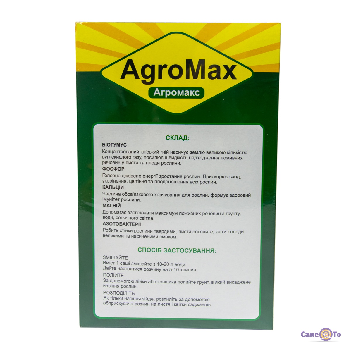 Після повного розчинення препарату у воді, необхідно дати йому настоятися протягом 10 хвилин. Далі їм можна поливати з лійки озиму грунт, в якій вже посаджені насіння рослин. В упаковці по 12 саше. Добриво АГРОМАКС містить біогумус, фосфор, кальцій, магній і азотобактерії. Всі ці речовини в складі дають необхідний ефект для рослин. Купити такий набір можна у нас за доступною ціною. Підготуйтеся до хорошого урожаю заздалегідь.