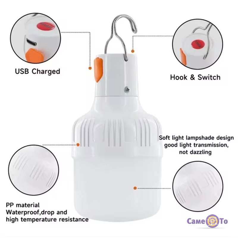 Цей світильник на акумуляторі є незамінним супутником для кемпінгу та туризму. Кемпінговий ліхтар забезпечує яскраве світло та довгий час роботи. Акумуляторні лампи зручні у використанні та легко заряджаються через USB. Акумуляторна лампочка компактна та легка, що робить її зручною для перенесення. Акумуляторна лампа підходить для використання як вдома, так і в походах.
