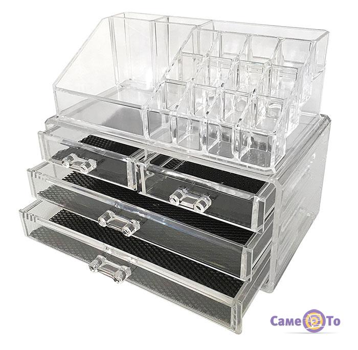 Три нижніх яруси органайзера Cosmetіc storage box займають висувні ящики, в кількості 4 штук. Прозорі стінки ящиків дозволяють розгледіти їх вміст без необхідності відкриття. Це дозволить заощадити час на пошуки потрібного засобу, навіть якщо Ви забули, в яку скриньку його поклали.