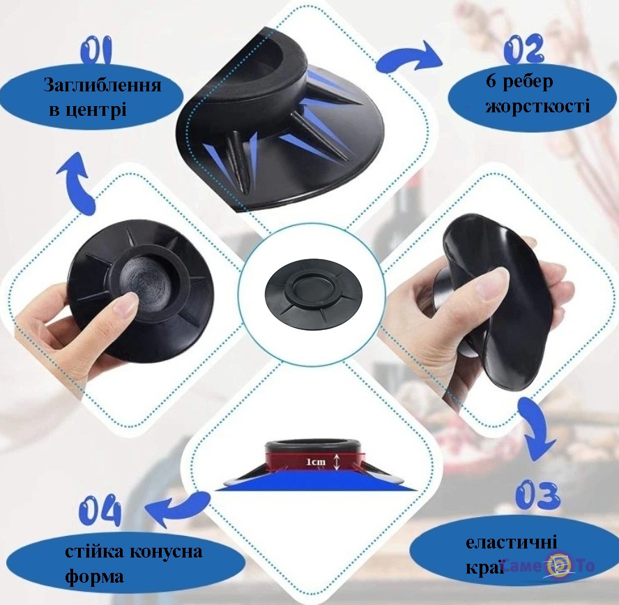 Продаются антивибрационные подставки комплектом из 4 штук. Изготовлены они из прочной резины, поэтому прослужат вам на протяжении длительного времени, не боясь большой нагрузки. Подставки для стиральной машины используются не только для минимизации шума и вибрации, но и защищают напольное покрытие от царапин. Чтобы установить ножки для стиральной машины не понадобятся инструменты. Вам нужно просто поднять каждый угол поочередно и подложить антивибрационные подставки под стиральную машину.