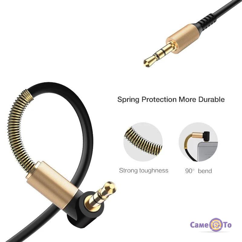 Данный аух шнур имеет в свернутом виде длину в 38 см, но растянуть его можно до 170 см. Этого будет достаточно для того, чтобы провод aux использовался комфортно и при любых условиях. Перед нами mini jack 3.5 mm. Очень важно, что шнур aux имеет изогнутый под 90° выход и пружину, которая защищает его от перелома при перегибании самого кабеля.