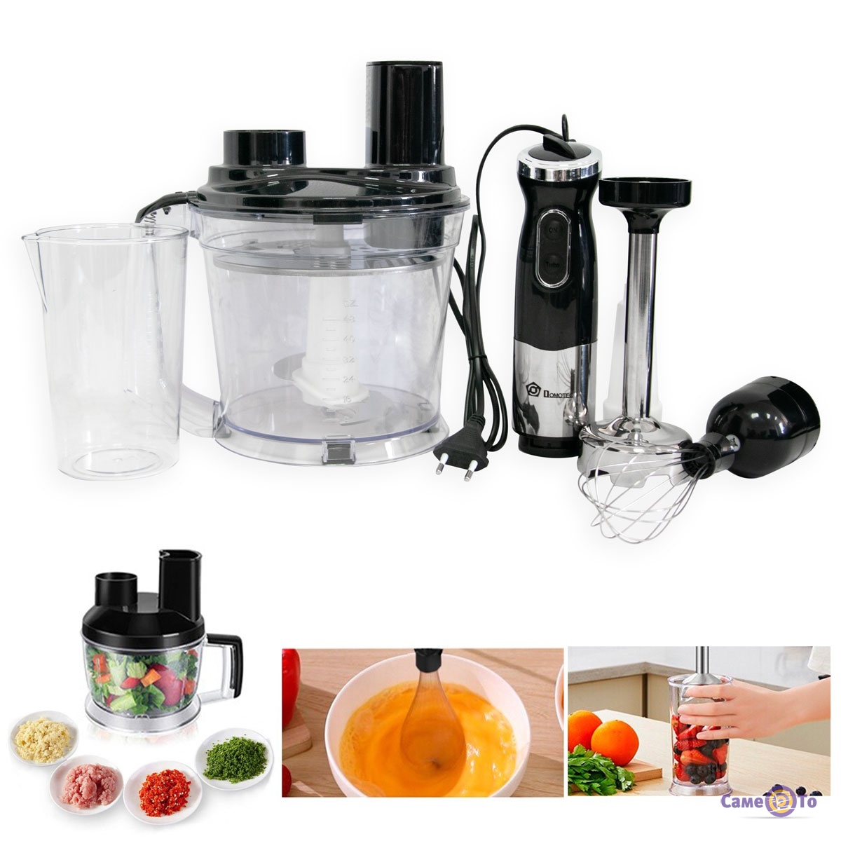 Мультифункціональний занурювальний блендер Domotec MS-5106 укомплектований п'ятьма різними насадками. Завдяки великій різноманітності функцій, таким блендером можна подрібнити і приготувати будь-які страви. Такі, як лимонад, смузі, гаспачо, домашній майонез та інші соуси, можна подрібнювати горіхи і насіння, збивати білки, шинкувати овочі та зелень.