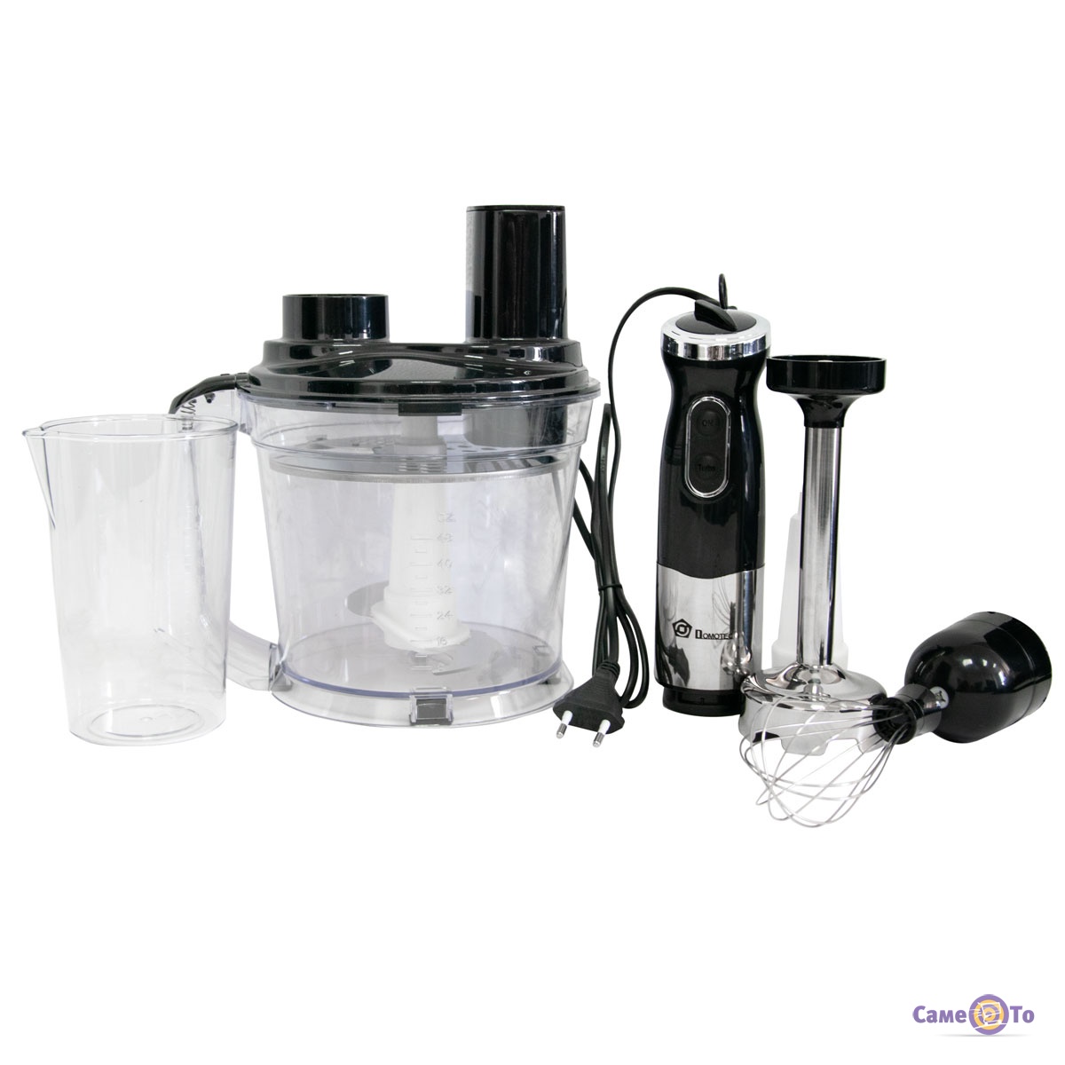 Комплект насадок блендера Domotec MS-5106 складається з мірної чаші-подрібнювача, двостороннього диска для натирання продуктів або шинкування, віночка, та стандартного подрібнювача занурювального блендера. У комплектацію даного блендера також входить мірна чаша на 500 мілілітрів, перехідник-редуктор для насадки віночка, кришка-редуктор для чаші-подрібнювача і опорний вал для шинкувального диска.