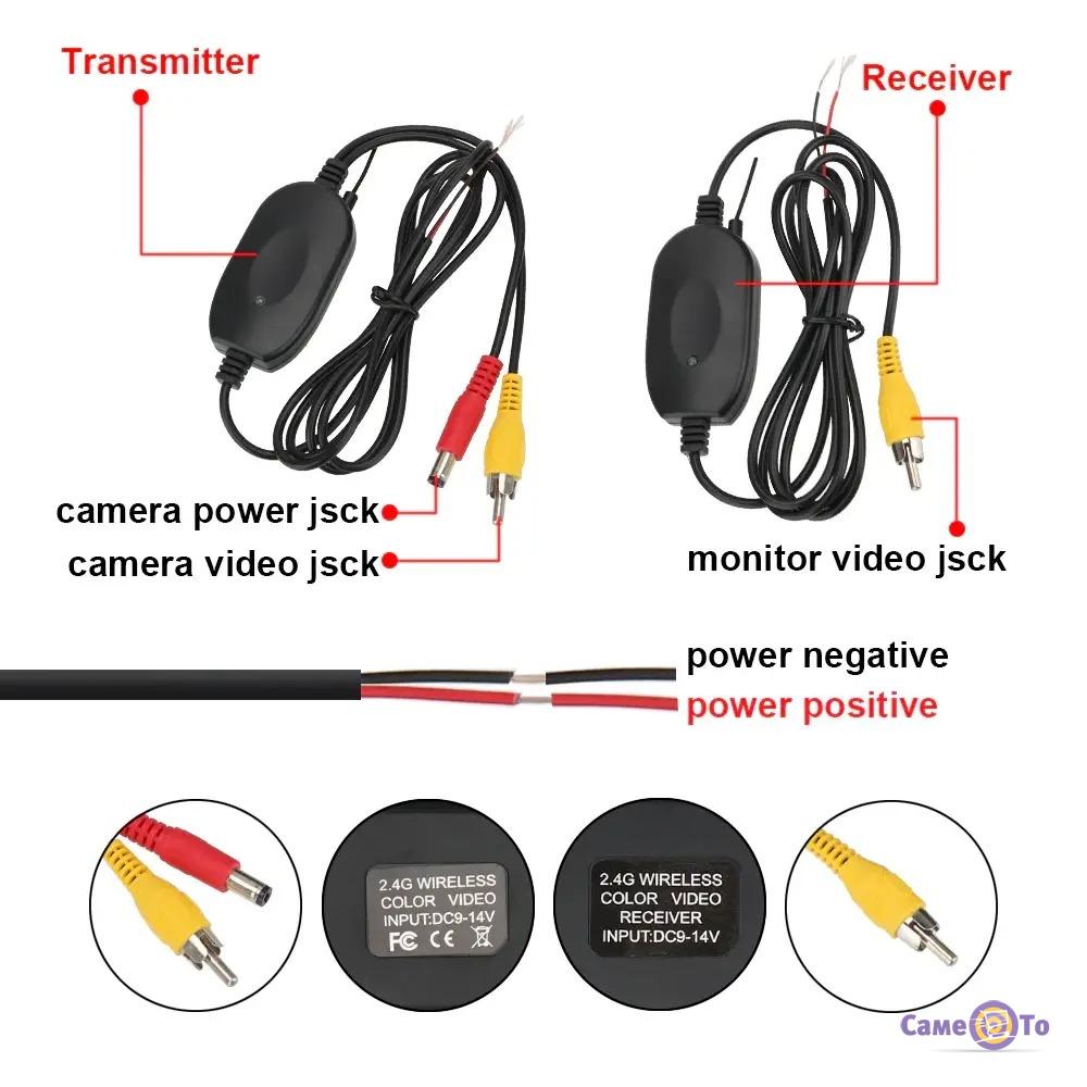 Изделие оснащено специальным разъемом RCA и круглым штекером для подключения камер заднего вида. Это передатчик 2.4 ггц, т.е. такая его рабочая частота беспроводной передачи сигнала.