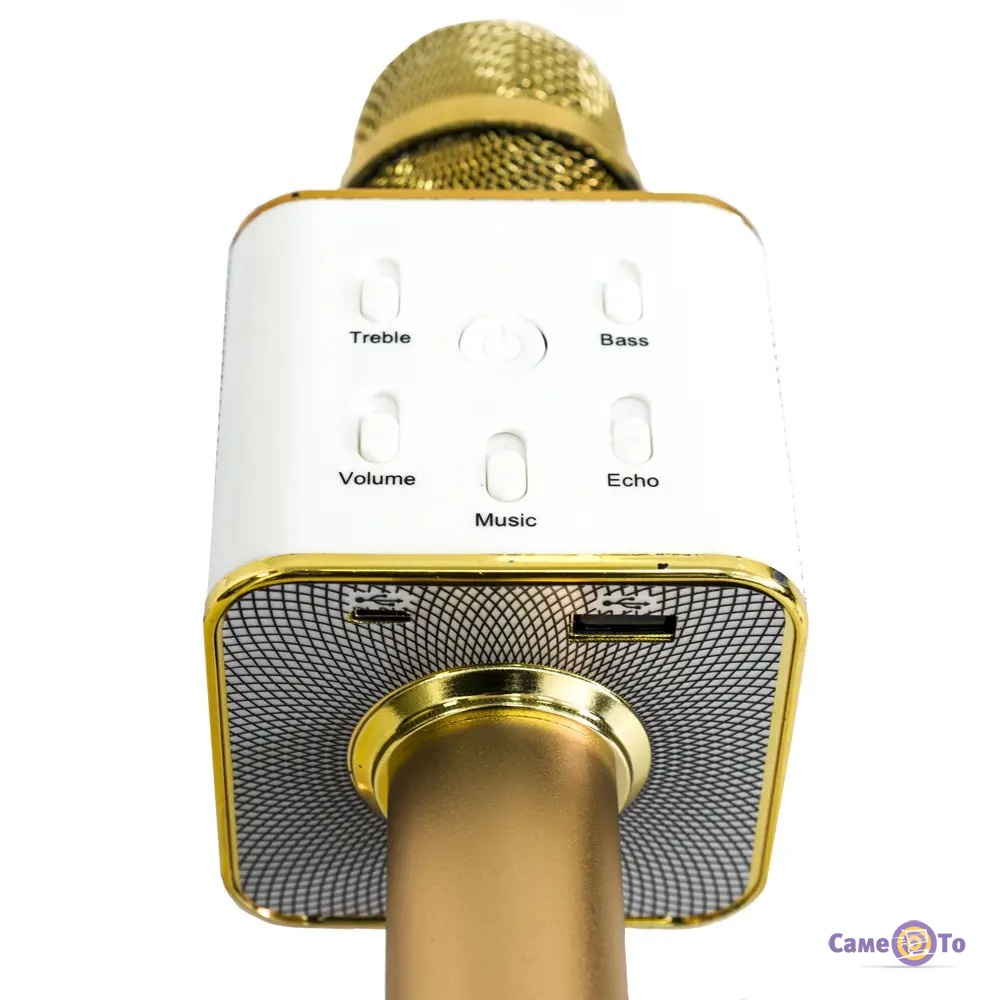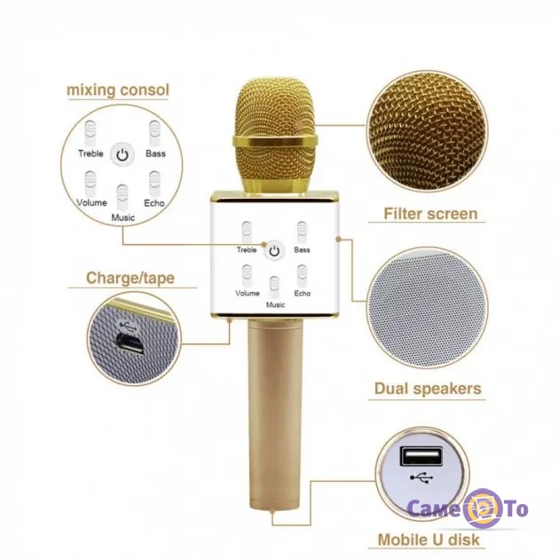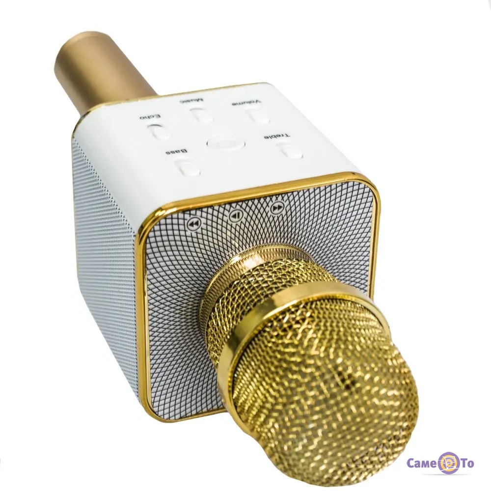 Перед нами Bluetooth мікрофон, в роботі якого не буде прив'язки до проводів, підключити його можна без шнурів. Цей бездротовий мікрофон володіє широким набором функцій, наприклад, тут є вбудовані динаміки, що сприяють посиленню голосу, можливість спотворення голосу, використання ефекту відлуння. Даний мікрофон блютуз здатний здійснювати запис пісні. Важить виріб всього 300г, тому перед нами хороший дитячий мікрофон караоке, що підійде і дорослим. А головне - продається він за доступною ціною.