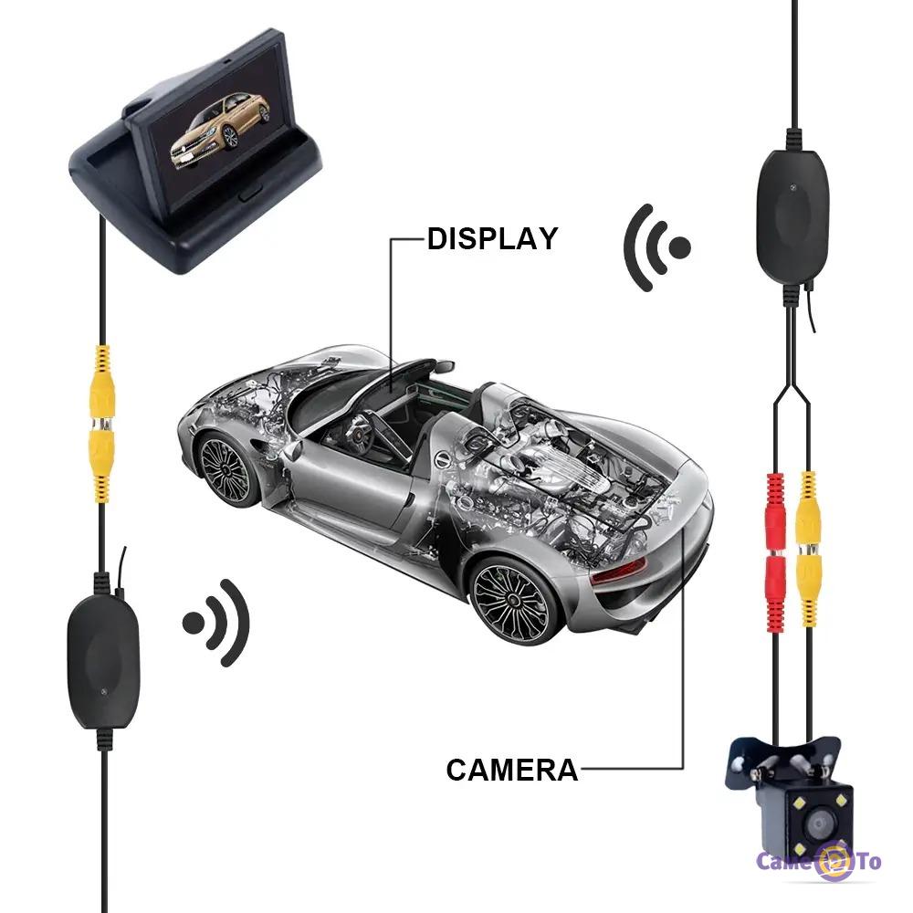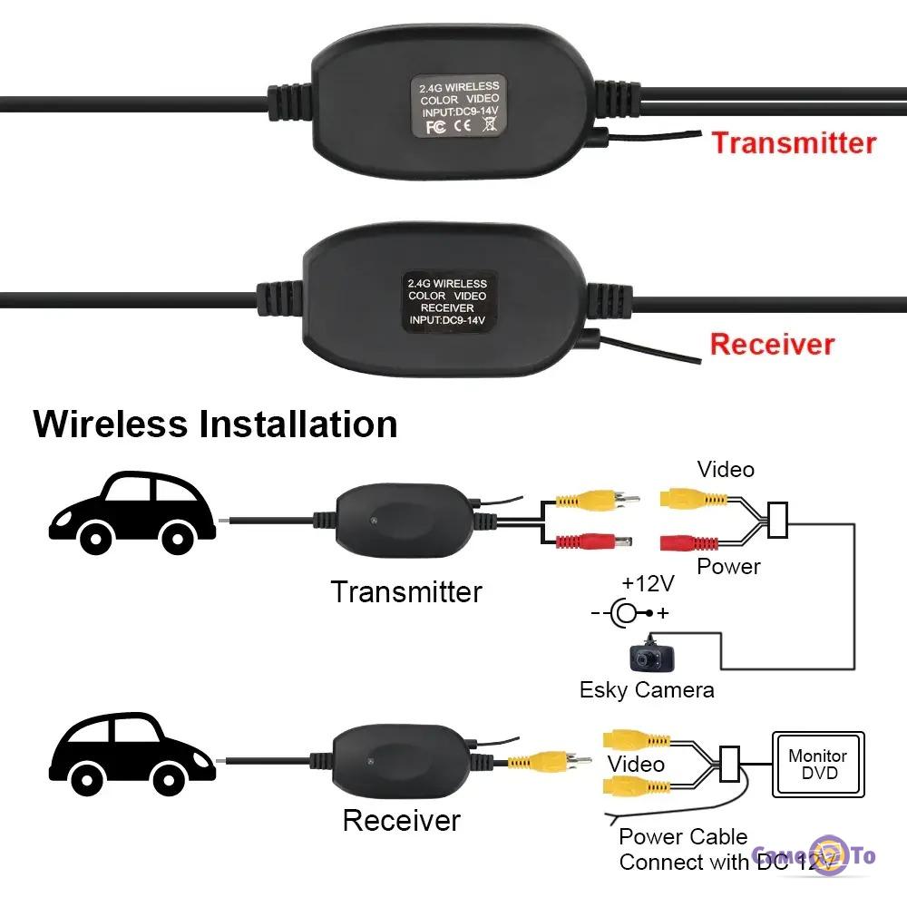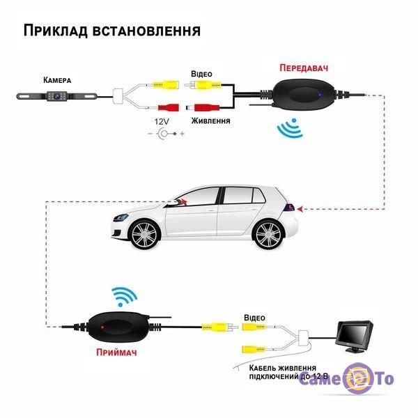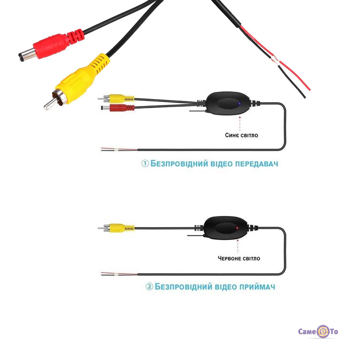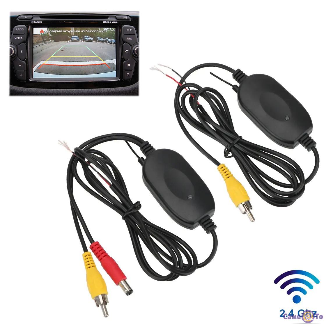 Виріб оснащений спеціальним роз'ємом RCA та круглим штекером для підключення камер заднього виду. Це передавач 2.4 ГГц, тобто така його робоча частота бездротової передачі сигналу.