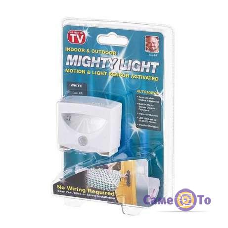 Cвітильник з датчиком руху Mighty Light працює від крони і оснащений світлодіодними лампами, довговічними і такими, що дозволяють економити електроенергію. Коли ви заходите у приміщення, фотодатчики світильника розпізнають рух і запускають автоматичне включення світла, але слід взяти до уваги, що світильник вмикається ТІЛЬКИ в темряві.