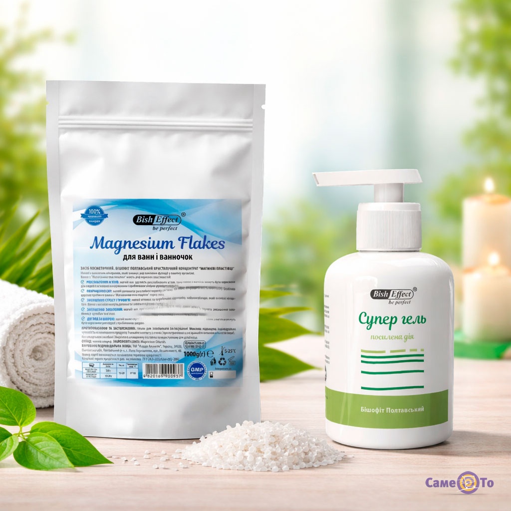 Бішофіт полтавський — це природне джерело магнію, яке широко застосовується для догляду за тілом, суглобами та м’язами. У складі комплексу поєднуються бішофіт гель для суглобів та спини, а також бішофіт для ванн у формі пластівців чи концентрату. Такий підхід дозволяє впливати одразу в двох напрямках: локально — як мазь від болю в суглобах та м’язах, і загальнозміцнююче — через магнієві ванни з бішофітом для глибокого розслаблення та відновлення після навантажень.