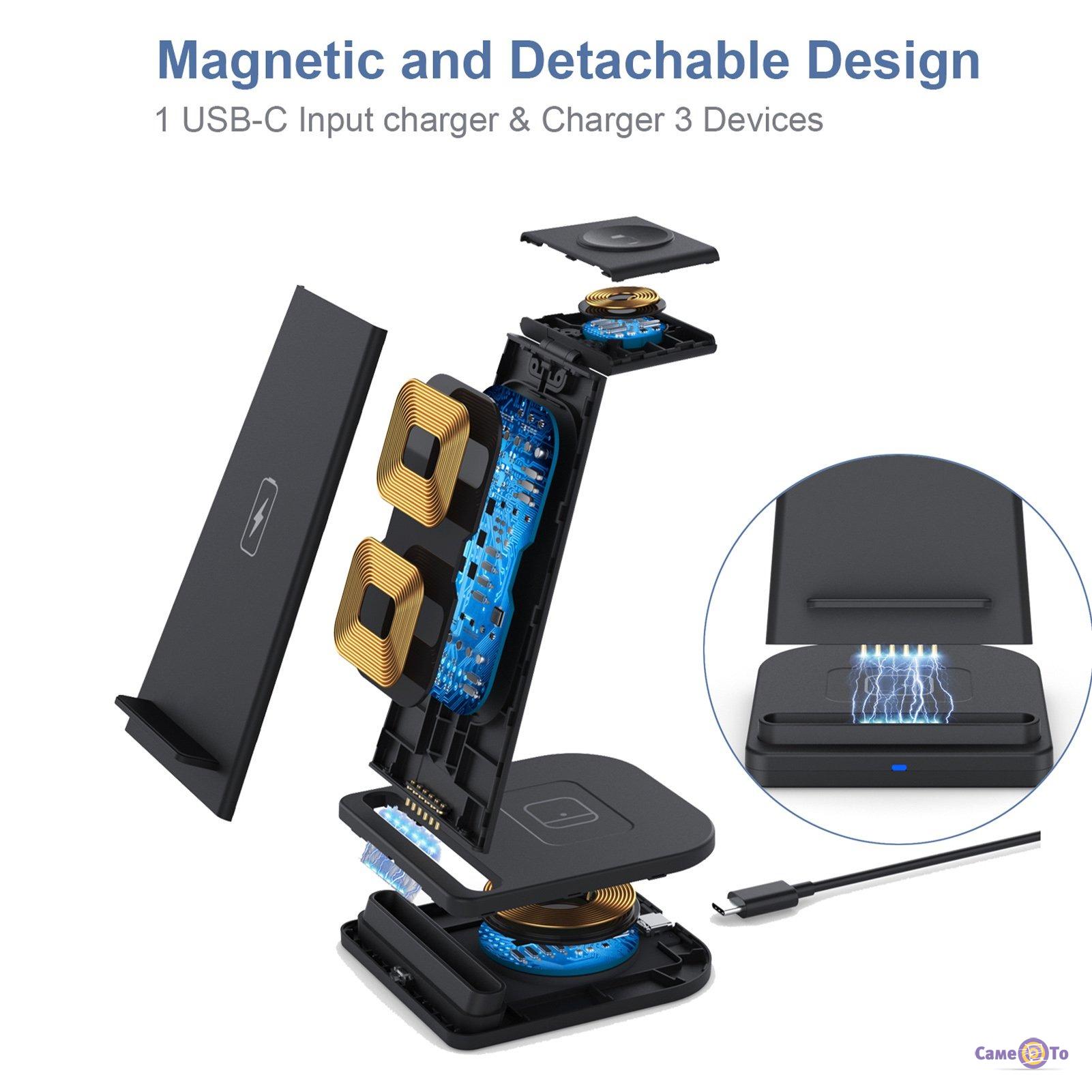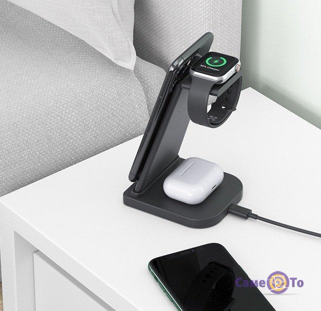 Беспроводная зарядка – это практичная и удобная вещь, которая должна быть у каждого. И сегодня мы вам рекомендуем такой вариант как зарядка для телефона Wireless Charging Stand 15W. Это зарядное устройство для телефона 3 в 1, благодаря которому вы сможете одновременно заряжать несколько гаджетов, например, наушники, смартфон и фитнесс-браслет. Изделие оснащено специальным выходом USB, поэтому у вас будет возможность даже подключить зарядку по кабелю, а не только использовать беспроводную.
