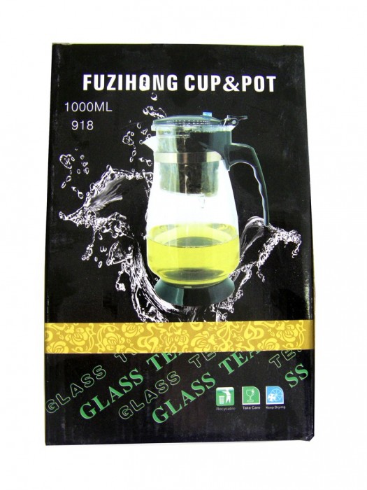 Сам чайник-заварник скляний, а внутрішня ємність для засипання заварки виконана з прозорого термостійкого пластику, що витримує температуру 125 градусів, виготовленого в Японії. Саме з цього пластика виготовляють дитячий посуд. У комплект входить герметична кришка, також виконана з термостійкого пластика.