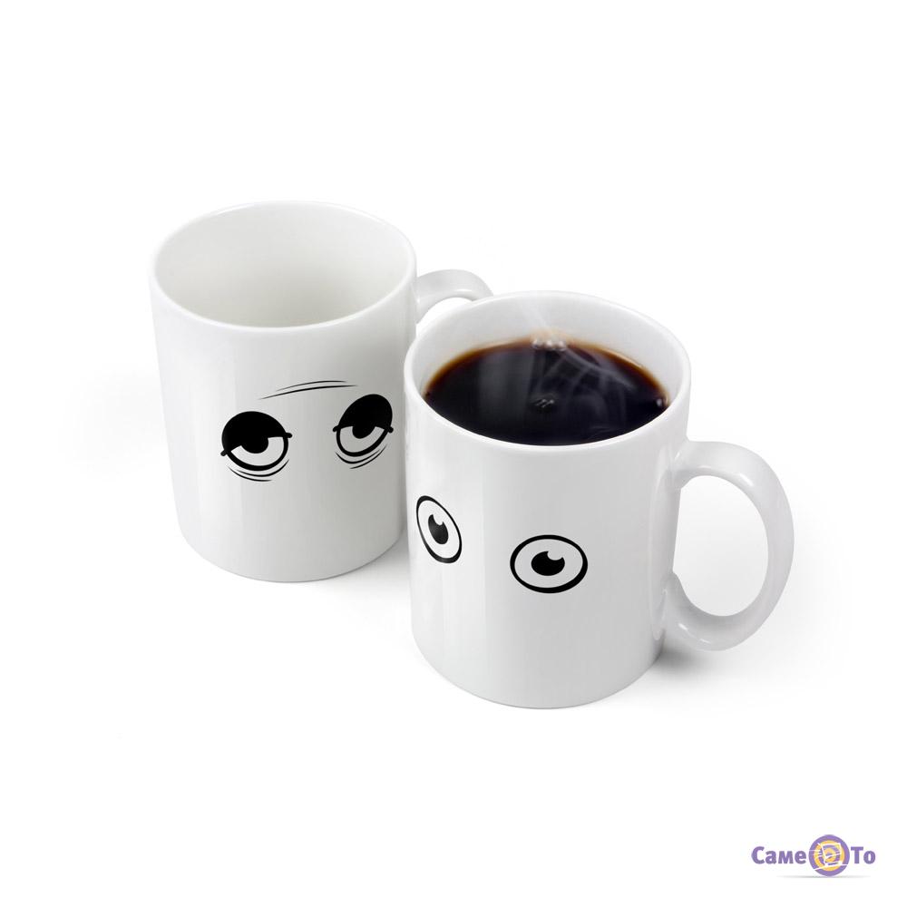 Що відбувається з Вами, коли в Ваш організм починає надходити гарячий напій, що бадьорить? Очі починають відкриватися. Те ж саме відбувається і з чашкою Wake-up cup. Так що, дивлячись на чашку, Ви будете бачити, як змінюється вираз Вашого обличчя з боку. Але ж так приємно, коли хтось поруч відчуваєте ті ж емоції що і Ви. Нехай це просто Ваша чашка.