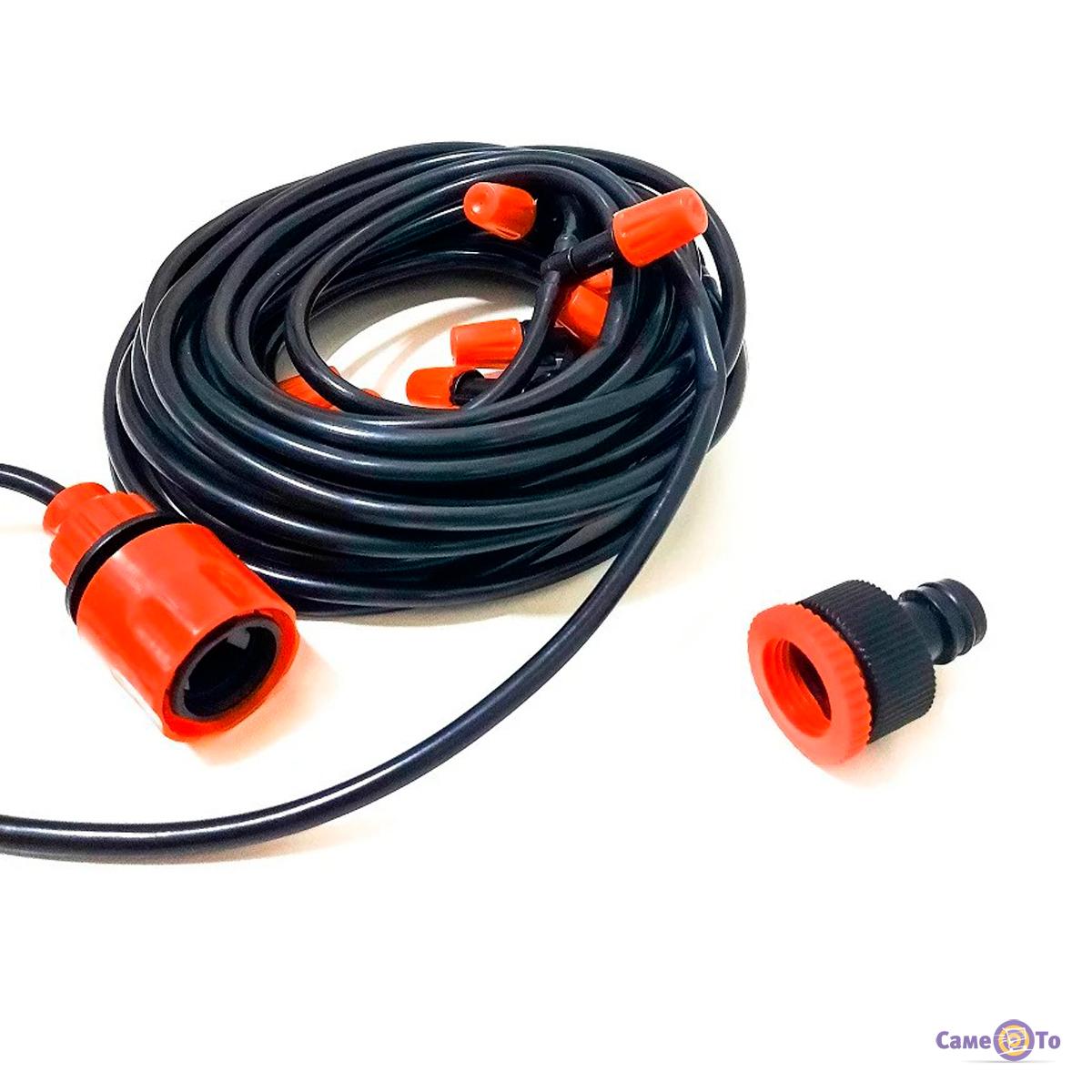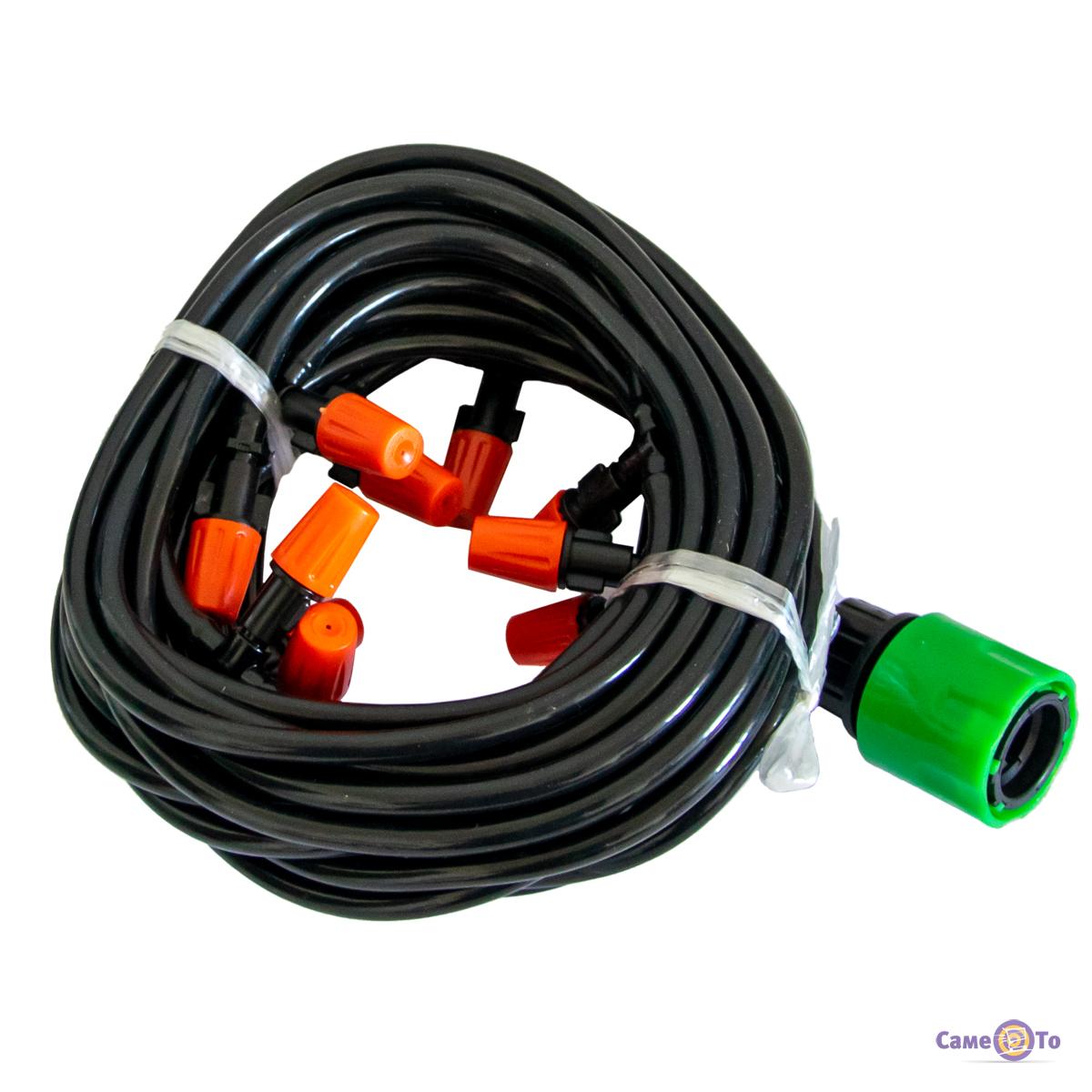 Система туманоутворення застосовується для поливу на відкритій місцевості. Ідеально підходить для створення вологого мікроклімату у теплицях чи місцевостях, де вирощуються рослини. Туманоутворювач для альтанки виготовлений із ПВХ пластику чорного кольору. По довжині шланг дорівнює 10 метрам, тим самим може дістатись до важкодоступних місць. Система водяного туману здатна розпорошувати на відстані до 1м. Форсунки з регуляцією розпилення не дають витрачати зайву рідину на полив рослин.