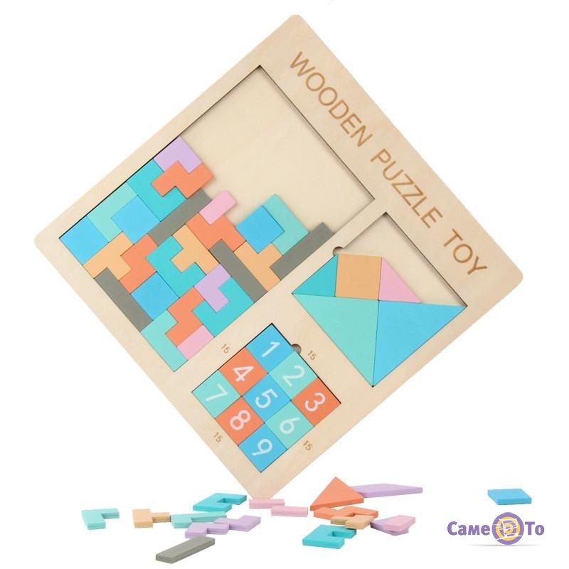 Ведь это же тот самый любимый тетрис из детства! Только деревянный, и складывается он уже не посредством нажатия кнопок, а руками. Помимо этого, с помощью игрушки можно сыграть в танграм - т.е. собрать квадрат, используя детали, которые входят в набор. Также в комплектацию входят фигурки для игры в пятнашки.