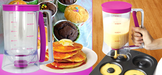 Диспенсер для рідкого тіста Batter Dispenser дозволить точно дозувати вміст посудини при заливанні форми для випікання і дозволить уникнути небажаних забруднень робочого місця. Диспенсер оснащений спеціальною шкалою і важелем, при натисканні на який відкривається отвір на дні пристрою, і тісто рівномірною цівкою витікає на сковорідку або деко.