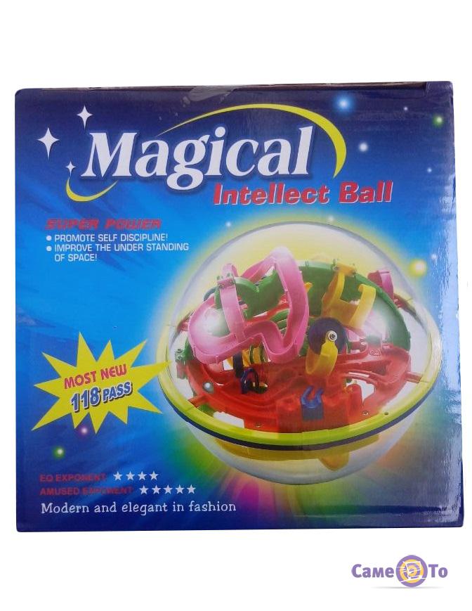 З головоломкою-лабіринтом Magical Intellect Ball на 118 кроків можна не тільки скоротати час, а зробити це з користю! Іграшка має форму обтічної пластикової кулі, всередині якої знаходиться захоплюючий маршрут по заплутаному лабіринту з різними перешкодами і труднощами. Покрокове проходження кульки всередині сфери по закладеним маршрутам вимагає високої концентрації уваги, точності, спритності і хорошого просторового мислення. Відповідно, всі ці якості в процесі ненав'язливої гри з лабіринтом-кулею динамічно розвиваються.
