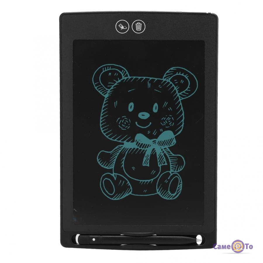 Характеристики LCD планшет для малювання 8.5 ": корпус гаджета виконаний з пластика, розмір екрану 8,5 дюймів. Є функція стирання і збереження від випадкового стирання, є ластик на зворотному кінці стилуса. Елементи живлення: 1 батарейка типу CR2016.