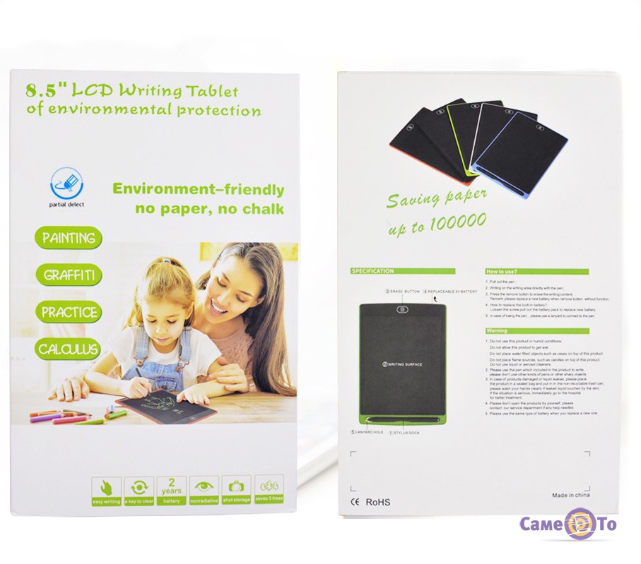 Девайс призначений для комфортного і простого малювання в графічній техніці. Він дозволяє вільно малювати, писати, коригувати зображення, витирати написане неодноразово. Виготовлений з міцного, нетоксичного пластику. Має яскравий LCDдісплей 8,5 дюймів.