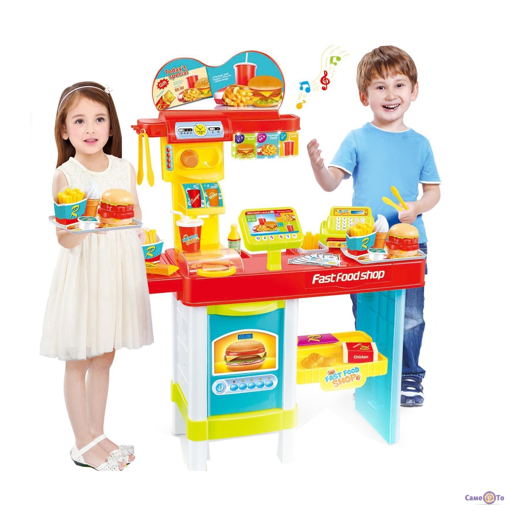 Игрушечный магазин для детей Fast Food Shop – это настоящий магазин с продуктами питания, играя с которым ребенок может почувствовать себя настоящим владельцем ресторана быстрого питания.