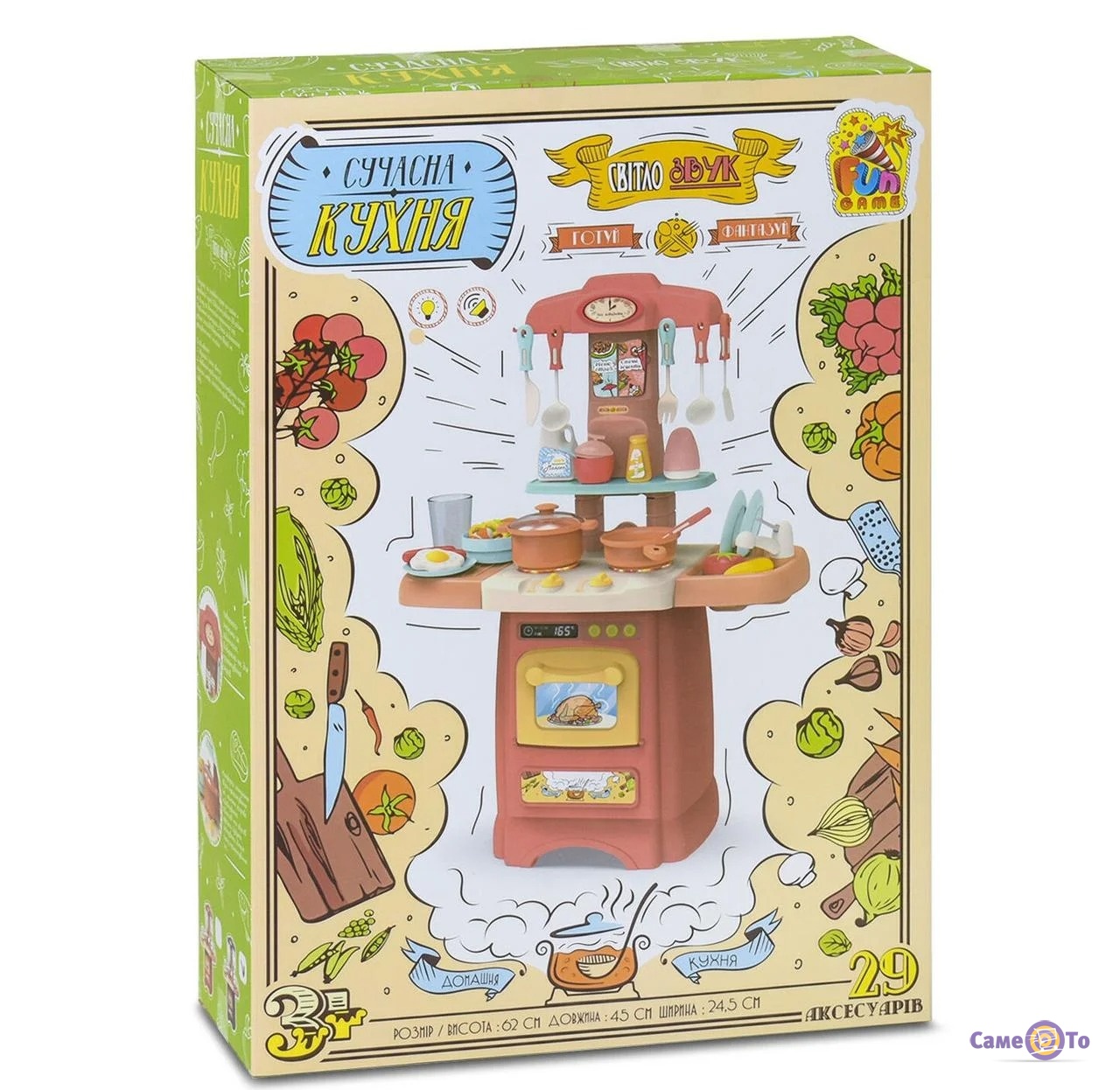 У комплект входять мийка для посуду, духовка, де навіть відчиняються двері - в ній же допускається зберігання дрібних предметів з набору. Також є мініатюрне кухонне приладдя, наклейки, а також плита з підсвіченими конфорками. Крім візуального оформлення, дитяча кухня іграшкова дозволяє не просто представляти дитині процес приготування їжі, але і чути його.