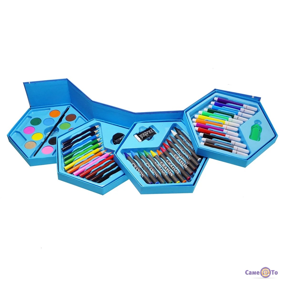 У наборі для малювання є художні приналежності, щоб малювати різними способами: кольорові олівці, пастельні крейди, фломастери, фарби. Коробка дуже зручна і стильна, вміщує в себе чотири відсіки для зберігання предметів для малювання. Також предмети в коробці надійно закріплені, тому набір для творчості зручно брати з собою в поїздку або подорож. Повірте, вашому малюкові сподобається втілювати фантазії в реальність на папері за допомогою яскравих олівців та фломастерів. Купити набір для творчості можна як хлопчикові, так і дівчинці на будь-яке свято.