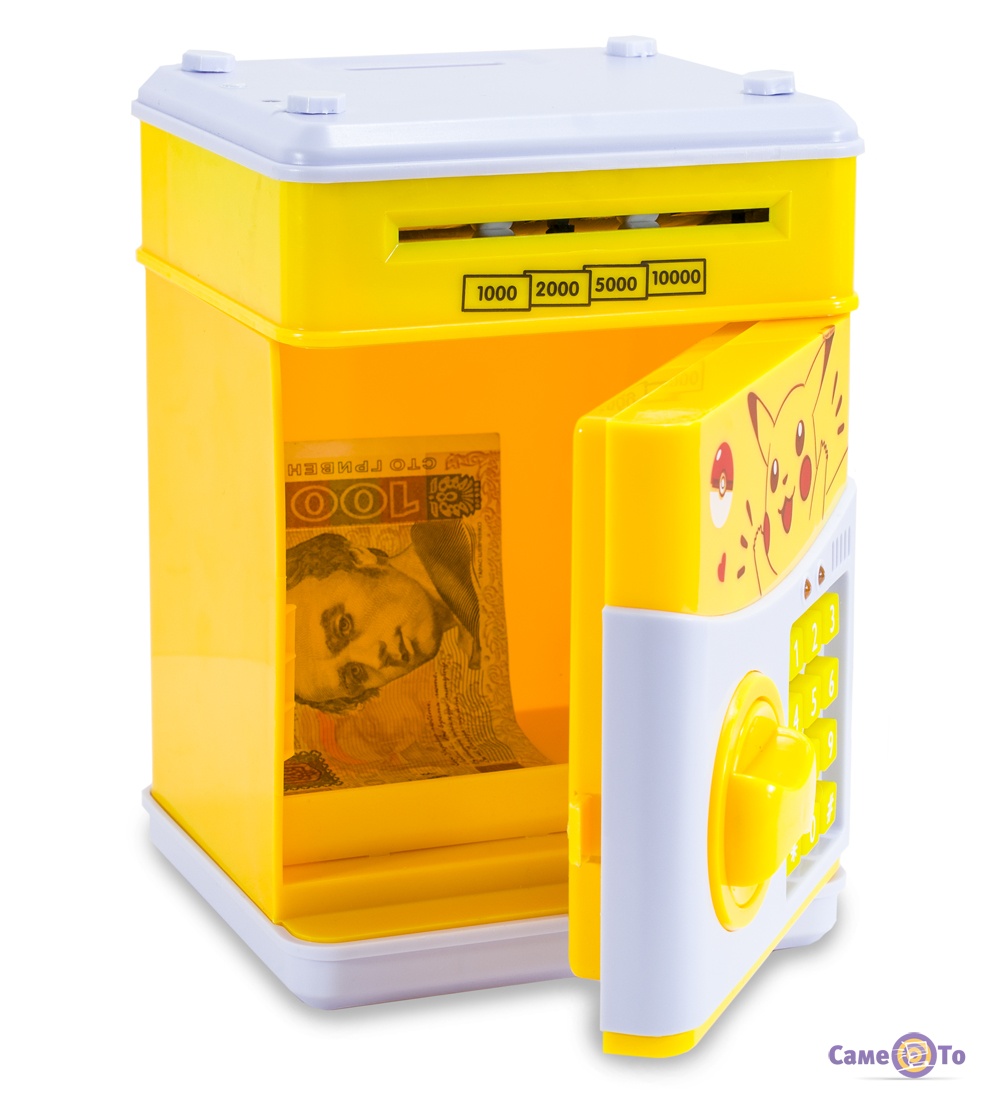 Іграшковий сейф-скарбничка виконана в жовтому корпусі. На лицьовій стороні сейфа зображений Пікачу. Скарбничка включає в себе купюроприймач , жовтий кран і кнопки. Дверцята сейфа відкриваються за допомогою чотиризначного кодового пароля. Для того щоб задати пароль, необхідно ввести заводський код з чотирьох нулів, затиснути "*" на панелі з кнопками і ввести ваш новий пароль, після чого тримати "*" до тих пір, поки індикатори згаснуть. Якщо Ви забули пароль необхідно витягти батарейки на кілька хвилин, після чого скарбничка повернеться в заводський стан. Вбудований купюроприймач сейфа автоматично засмоктує піднесені купюри. Також додатково присутнє синє підсвічування, яке імітує УФ-контроль справжності банкнот. Купюроприймач не зчитує номінал купюр. Крім цього, скарбничка приймає монети. Вбудований музичний режим, який можна увімкнути та вимкнути, натиснувши на "#". Сейф видає тривожні звуки, якщо його дверцята залишилися відкритими протягом 10 хвилин. Для роботи пристрою необхідні три класичні батарейки формату АА (в комплект не входять). Акумуляторні батареї до використання не рекомендуються. Джерело живлення потрібно замінити, якщо купюроприймач погано затягує купюри або дверцята відкриваються без клацання. Габарити: довжина - 13 см; ширина - 12 см; висота - 19 см. У комплект з сейфом йде інструкція англійською мовою. Іграшка не призначена для дітей молодше шести років.