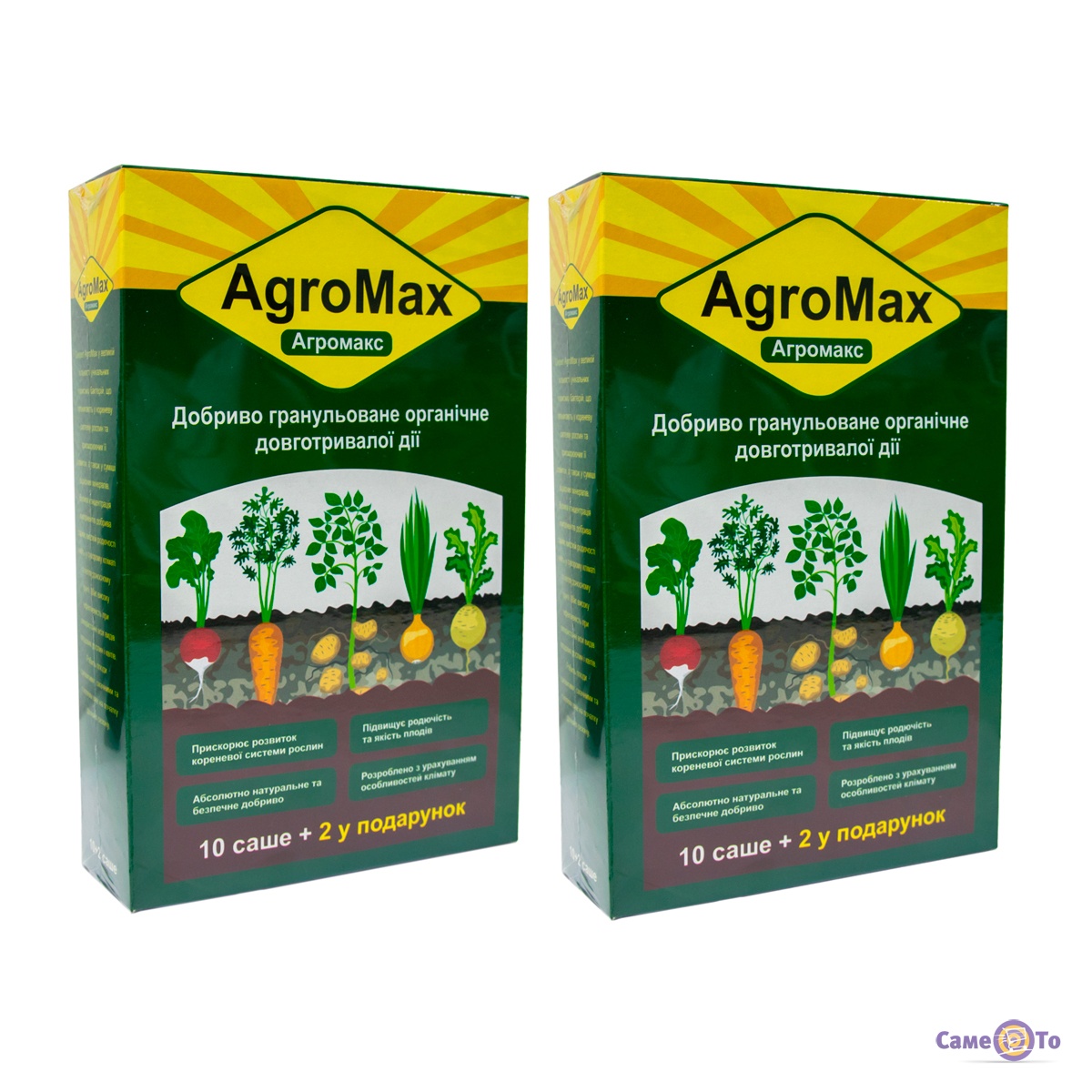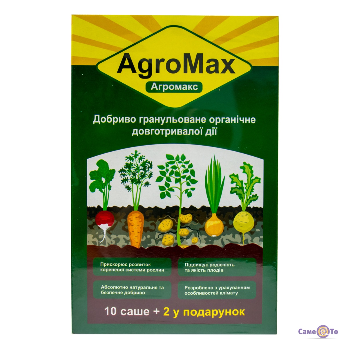 Agromax удобрение для картошки - универсальная эффективная добавка в виде удобрения, которая ускоряет рост любых растений. За счёт своей инновационной разработки агрономы могут повысить урожай без использования химических удобрений. Такое средство может использоваться для прикормки растений и плодово-ягодных культур. Агромакс для картофеля спокойно может повысить урожайность независимо от вида почвы, а также эффективно влияет на прорастание семян. Использовать его очень просто, достаточно смешать одно саше на 10 л воды. После чего раствор должен настояться в течение 10 минут. Дальше им можно поливать из лейки озимую почву, в которой уже посаженные семена растений. Два пакета, в каждом из которых содержится по 12 саше. Агромакс добриво для картоплі содержит биогумус, фосфор, кальций, магний и азотобактерии. Все эти вещества в составе дают необходимый эффект для растений. Купить такой набор можно у нас по доступной цене. Подготовьтесь к хорошему урожаю заранее.