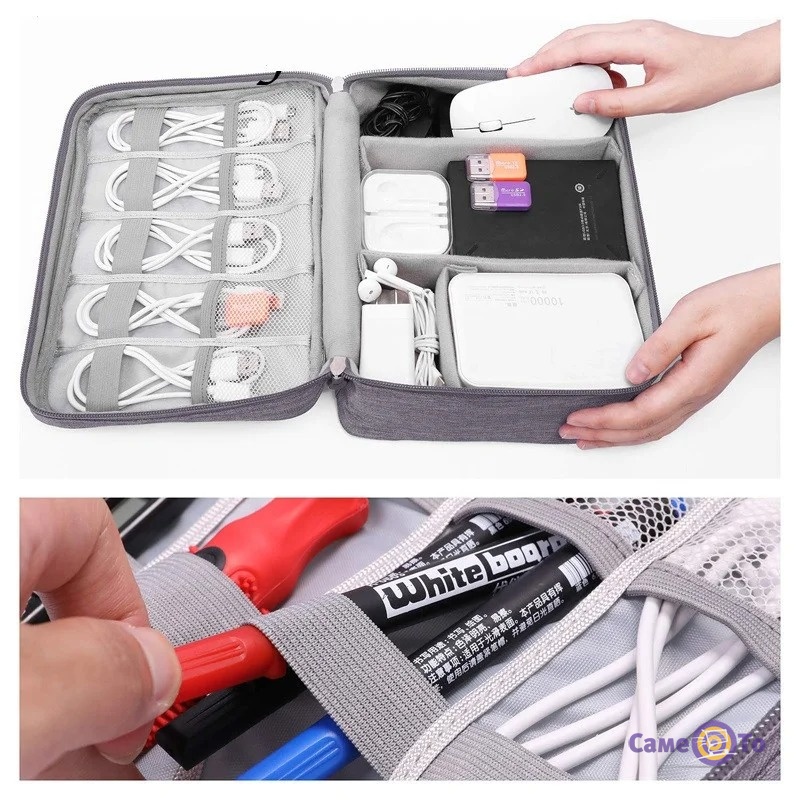 Органайзер для електроніки надійно застібається за допомогою блискавки.