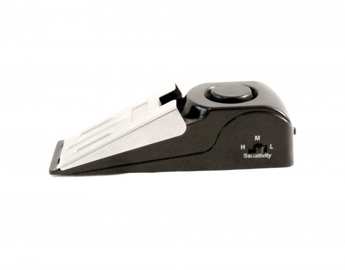 Конструкція Door Stop Alarm дуже проста. На невеликому корпусі з міцного пластику знаходиться металева клавіша, при натисканні на яку спрацьовує звуковий сигнал. На задній панелі корпусу є перемикач «ON / OFF», а на верхній - регулятор чутливості.