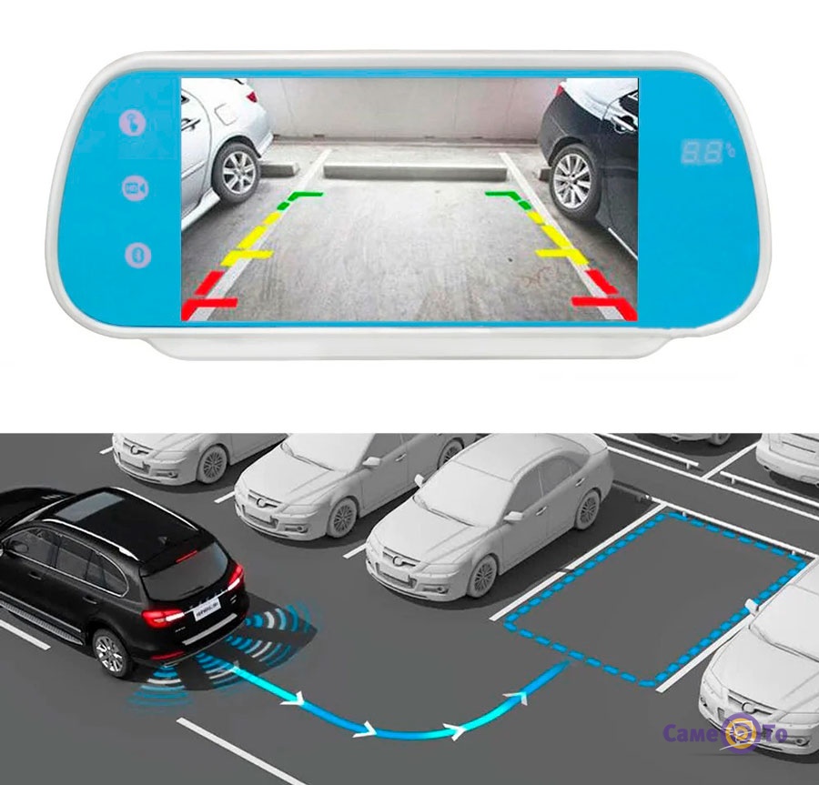 Дзеркало заднього виду з монітором дуже легко кріпиться на дзеркало будь-якого автомобіля. Має якісне антивідблискне покриття і функцію відключення дисплея, якщо у вас працює реєстратор. Дуже зручно те, що всі кнопки з управління приладом перебувають на передній частині пристрою. Живити монітор для камери дуже легко від прикурювача автомобіля завдяки кабелю підзарядки, який йде в комплекті з самим пристроєм. Прилад не приваблює увагу інших за рахунок того, що кріпиться до штатного дзеркала. Дисплей на 7 дюймів дуже добре показує зображення і настройки приладу. У комплекті з монітором для камери поставляється пульт і дроти підключення.