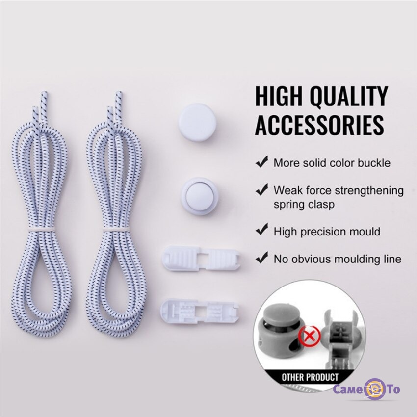 Шнурки, що самозатягуються, виконані з гуми високої якості, що забезпечує тривалий термін придатності виробу. Ліниві шнурки – це практичне рішення для всіх – дітей, дорослих та літніх людей. Аксесуар робить взуття більш комфортним та зручним, а також повністю знижує ризик невдалого падіння через довгі розв'язані шнурки.