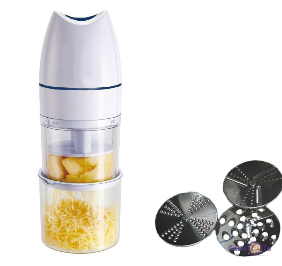 Електротерка One Touch складається з двох частин: прозорого бункера, в який поміщаються продукти, і робочої частини, в якій знаходиться механізм, що призводить тертку в дію. Додатково в комплект входить ще одна ємність для зберігання нарізаних продуктів. Ви можете натерти сир, горіхи, шоколад, моркву, картоплю і будь-які інші продукти, накрити їх щільною пластиковою кришкою і поставити на зберігання в холодильник.