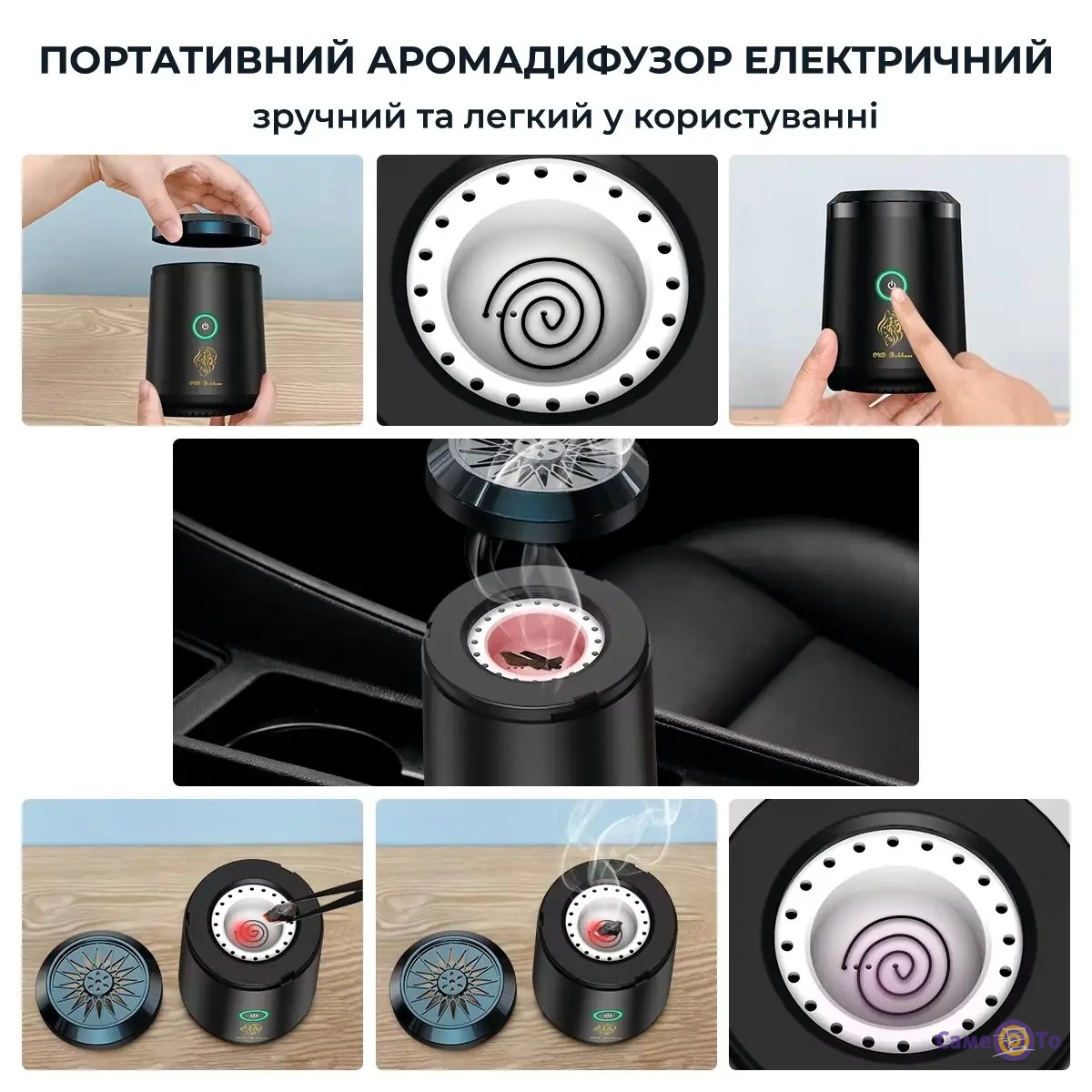 Чорний ароматний дифузор, що працює від USB, ідеально підходить для використання вдома або в офісі. Цей електричний аромадифузор ефективно поширює приємні аромати, перетворюючи будь-який простір на куточок затишку. Підходить для використання з різними пахощами. Компактний та портативний, він стане чудовим доповненням вашого інтер'єру.