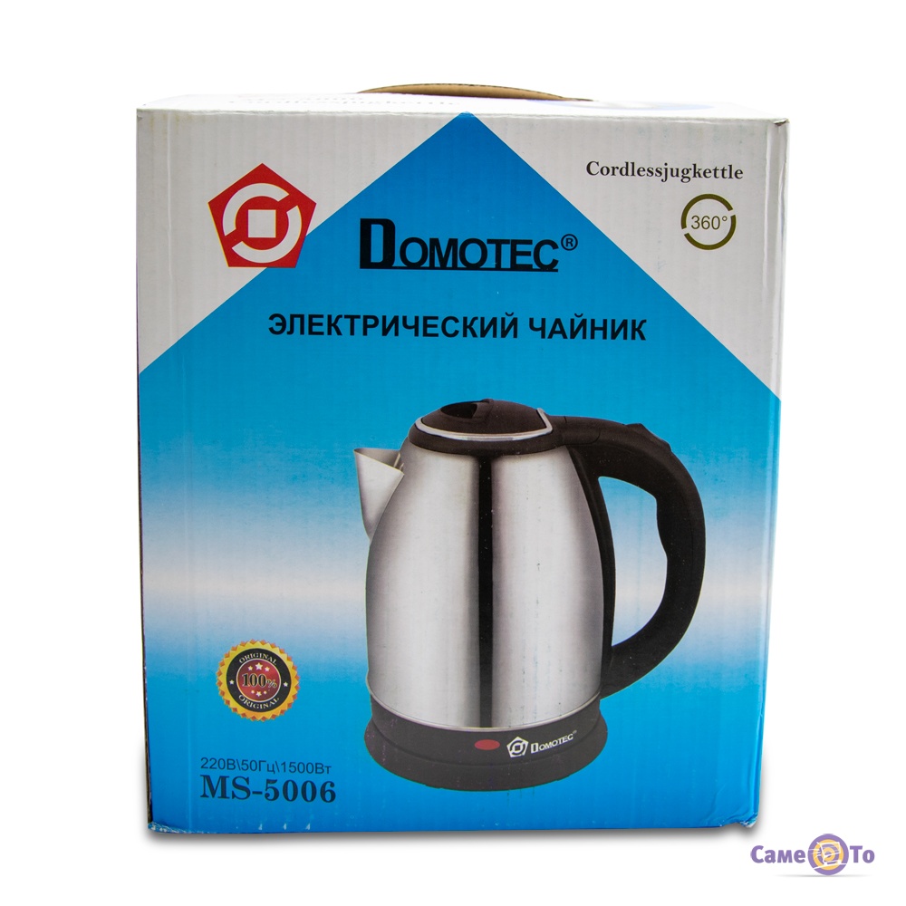 Електричний чайник Domotec MS 5006 має ємність 2 літри, що становить 9 чашок чаю або ароматної кави. Корпус чайника, а також внутрішнє покриття виготовлені з нержавіючої сталі, яка захищає прилад від корозії і слабоагресивних водних розчинів. Нагрівальним елементом є диск зі спіраллю всередині, яка прихована під пластиковим корпусом, для уникнення потрапляння вологи. Потужність чайника складає 1500 Вт, що розраховано на стандартну електромережу. Шнур на елементі нагрівання має довжину 65 см і обертається на 360 градусів, що дає можливість розмістити прилад з максимальною зручністю.