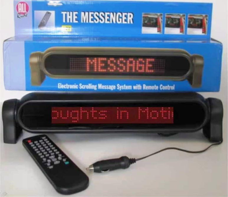 Встановлюється електронне табло в автомобіль досить просто, працює надійно і ефективно. Більш того, воно має компактні розміри і легку вагу. Запустити роботу пристрою можна за допомогою натискання однієї кнопки. А для його зручного управління продумана наявність дистанційного пульта, завдяки якому відбувається набір рекламного тексту, його редагування і збереження в пам'яті, тобто Вам абсолютно не доведеться підключати прилад до комп'ютера, щоб керувати текстом. Рядок здатен демонструвати написи російською та англійською мовами. Більш того, кожне повідомлення може відображатися на табло один раз, кілька або взагалі бути запрограмованим в спеціальні блоки.