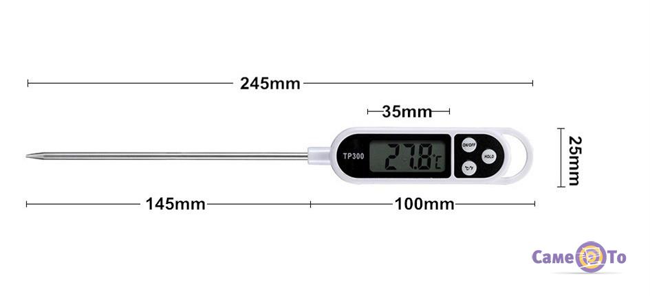 Кулінарний термометр ТР 300 дозволяє заміряти температуру в діапазоні від -58 до +572 градусів за шкалою Фаренгейта і від -50 до +300 градусів за шкалою Цельсія з точністю до 1 градуса.