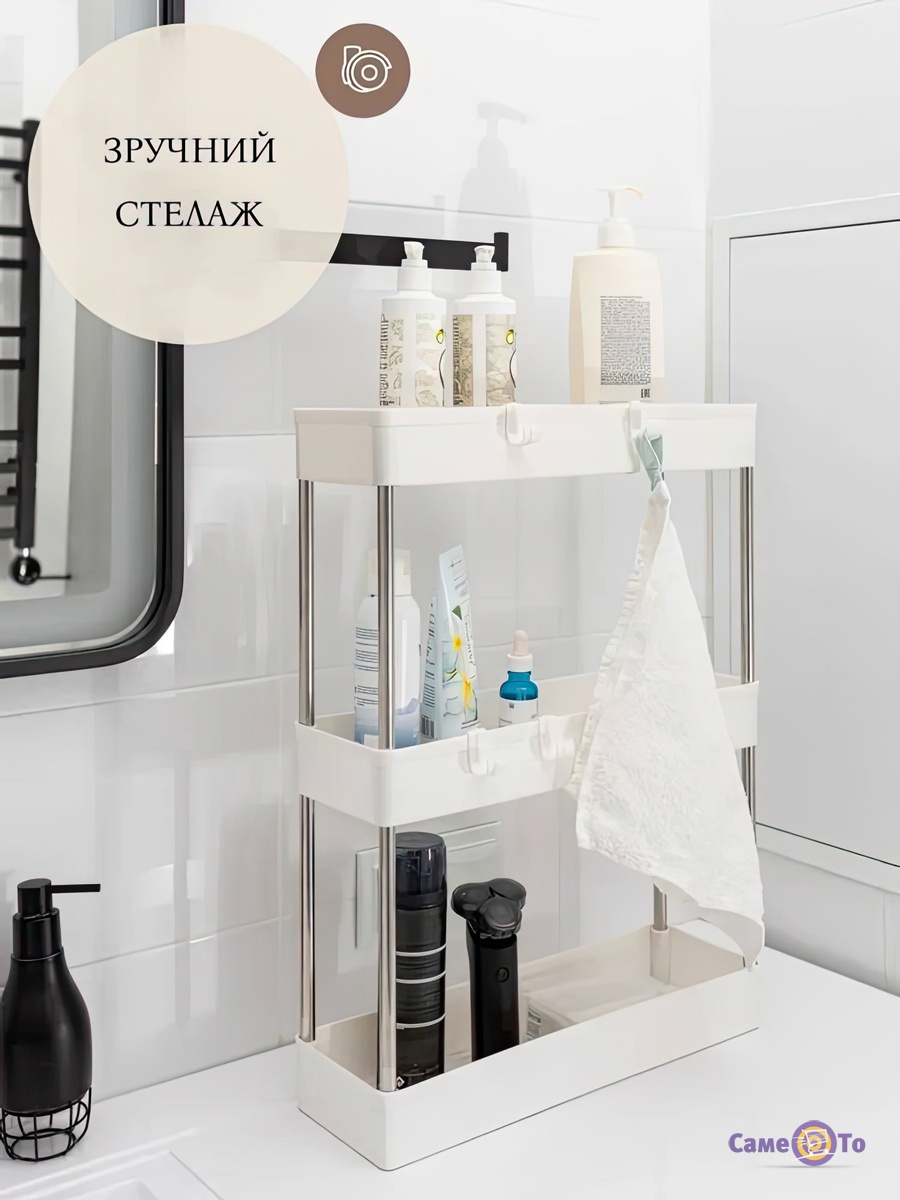 З трьома міцними полицями вам буде достатньо місця для рушників, гігієнічних засобів, косметики та інших необхідних предметів. Колеса роблять етажерку рухомою, що спрощує переміщення та прибирання у ванній.