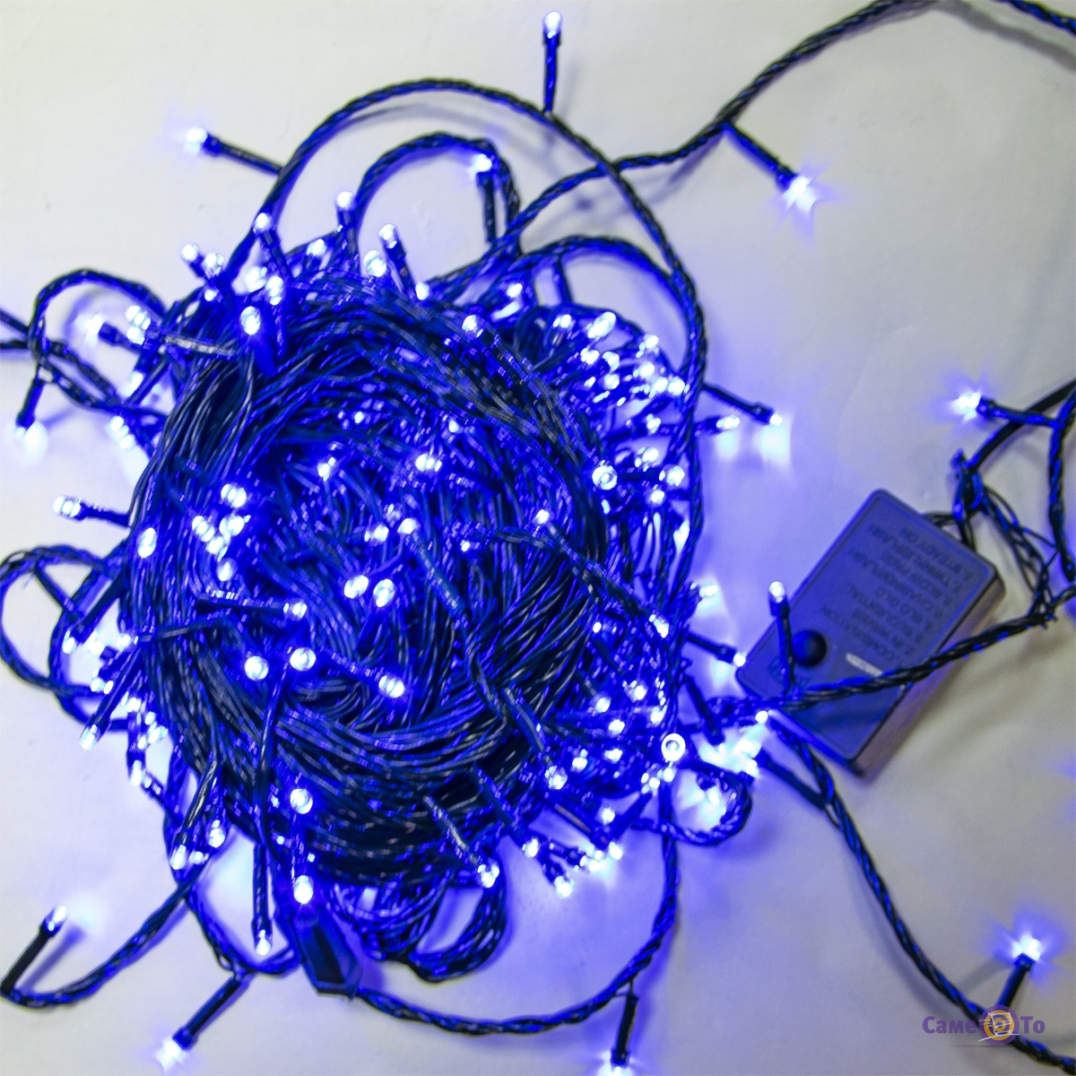Новорічна гірлянда дозволяє прикрасити приміщення з більшою площею, адже вона має здатність послідовно з'єднуватися з подібними пристроями. Кількість світлодіодних вогників в одній гірлянді – 250 шт. Колір їхній синій. Він дуже приємний для очей і не викликає жодного роздратування.