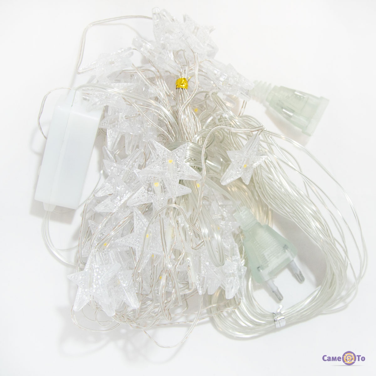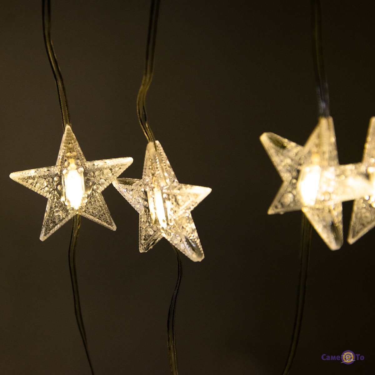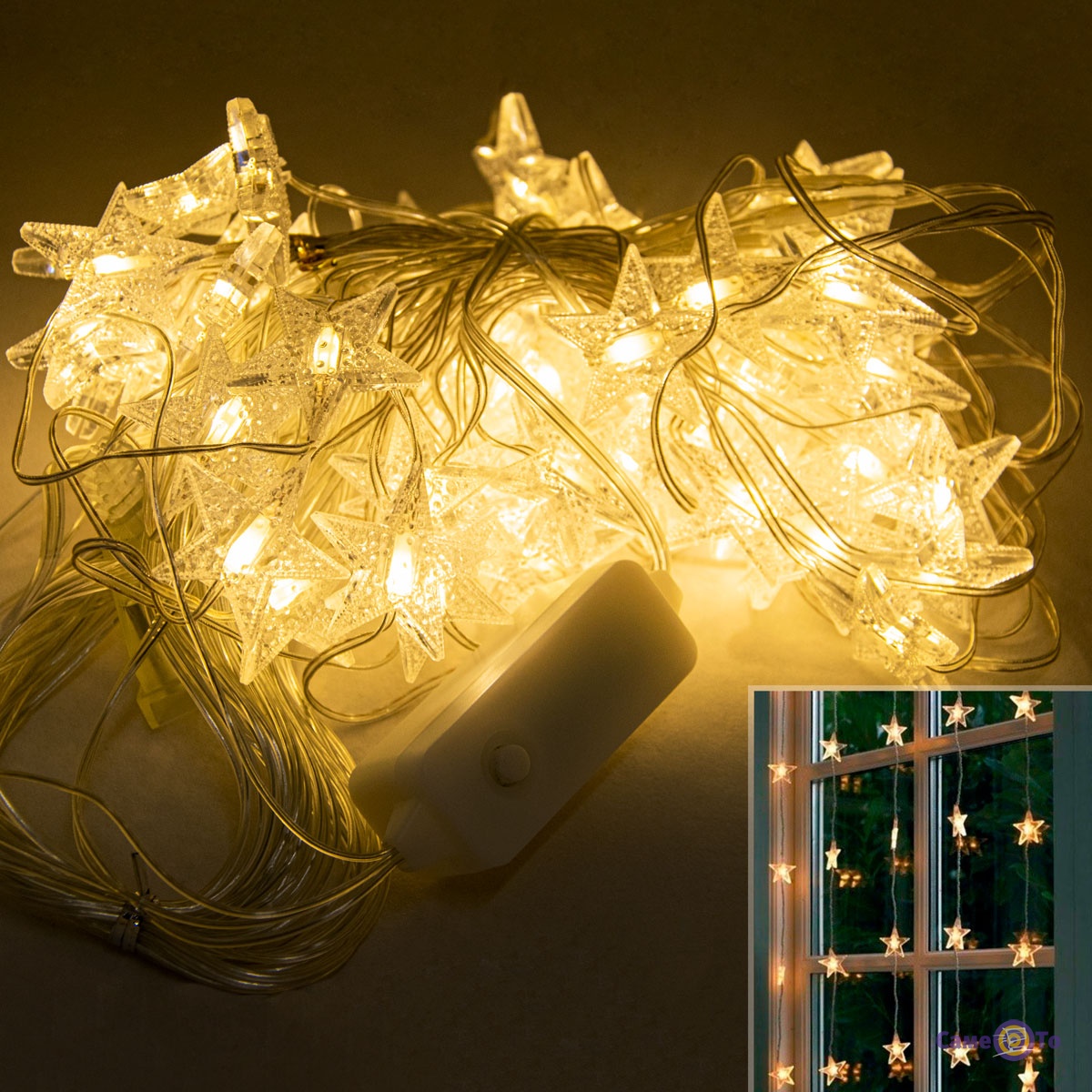 Легкая конструкция (260 грамм) без лишних усилий устанавливается на шторы и работает от стандартной однофазной сети в 220В. Прозрачный шнур питания не будет отвлекать внимание от яркой композиции из лампочек в форме звезд. Штора гирлянда длиной в 1000 мм и шириной в 3300 мм гармонично дополнит украшенное к зимним праздникам помещение.