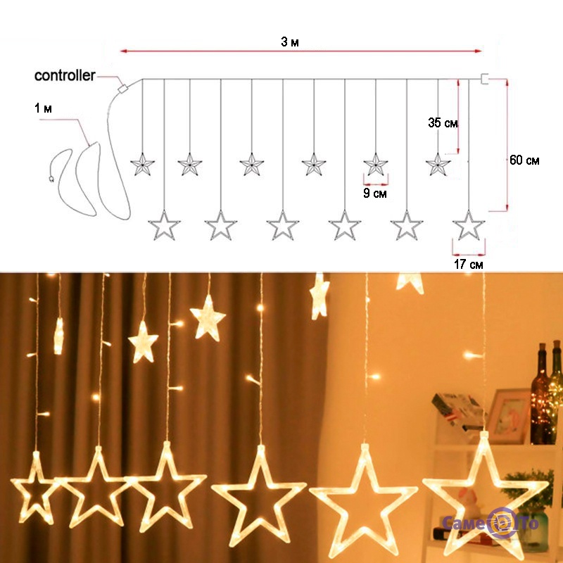 Зазначимо, що гірлянда штора на вікно має особливу дворівневу конструкцію. Верхній шар являє собою менші зірки, нижній – побільше. Такий контраст дарує неймовірну картинку. Світлодіодна гірлянда радує наявністю 8 режимів світіння, серед яких статичні і динамічні. Гірлянда зірки працює від мережі, підходить для використання всередині приміщення, не для вулиці. Ну а якщо вам сподобалися такі новорічні гірлянди, замовити їх можна в нашому інтернет-магазині «СамеТо» з доставкою по Україні.