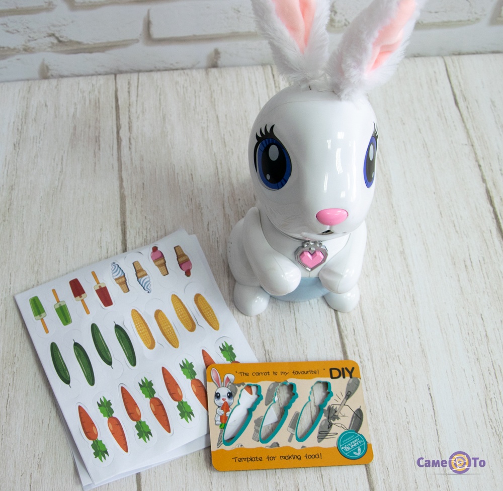 Під час того, як інтерактивний кролик зголодніє, він почне просити їсти, про це ви легко впізнаєте, так як він самостійно почне просити у вас їжу. У ситуації якщо частувань вже не залишиться, їх можна просто роздрукувати за допомогою трафарету, який йде в наборі.