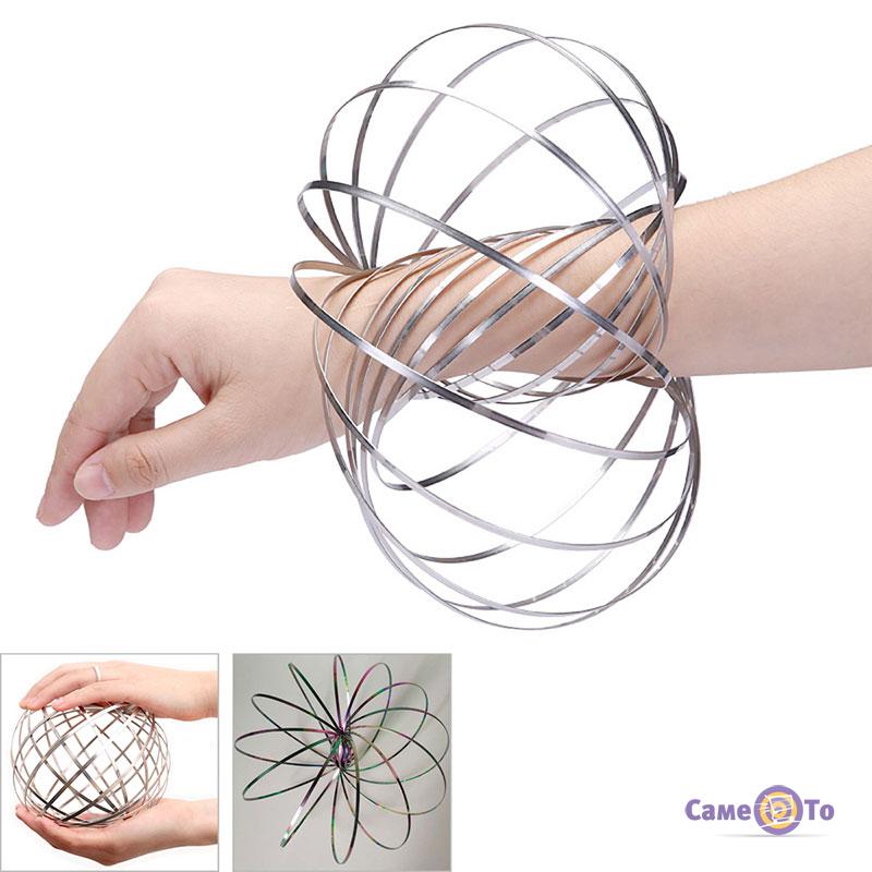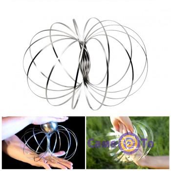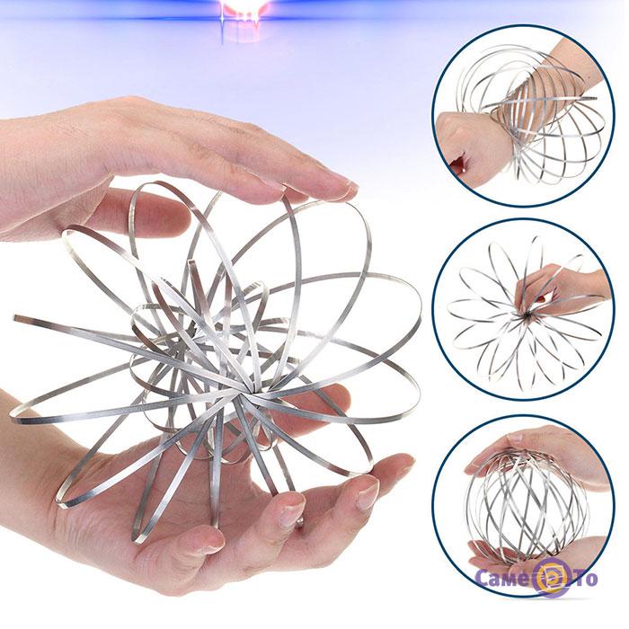 Торофлакс представляет собой стальную ленту, длина ее более восьми метров, а диаметр – 12.5 см. Внешне данная игрушка похожа на известную всем пружинку. Хотя разница между этими двумя предметами колоссальная. Торофлакс, например, может принять гораздо больше форм и положений. Больше всего восхищает его возможность закручиваться внутрь себя. Кроме того, с кинетическими кольцами каждый сможет почувствовать себя настоящим волшебником или фокусником. Если просунуть руку в центр, игрушка будет перемещаться и даже перепрыгивать с руки на руку. Согласитесь, зрелище просто волшебное! Еще кинетические кольца можно крутить вокруг любого предмета – палки, спицы или веревки. Они будут вращаться так быстро, что визуально убедят всех, что перед нами не пружина, а серебряный пузырь. Toroflux надолго увлечет ребенка, окажет на него антистрессовый эффект.