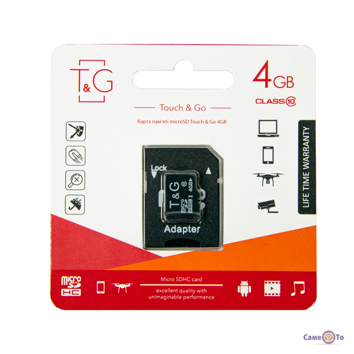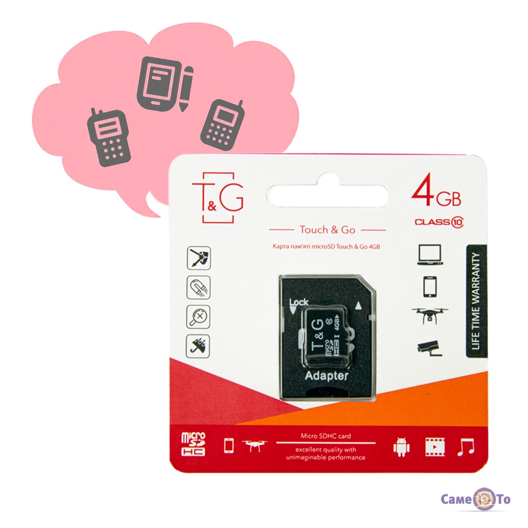 T&G microSDHC – це картка пам'яті для смартфона, фотоапарата, відеореєстратора та інших девайсів, що використовуються у повсякденному житті. Флеш-карта має об'єм 4 GB і компактні параметри. У комплекті з micro SD поставляється адаптер для використання картки в ПК, ноутбуці або будь-якому пристрої, що оснащений роз'ємом відповідного стандарту. Просто підключіть її до спеціального гнізда в корпусі пристрою, і забудьте про нестачу пам'яті.
