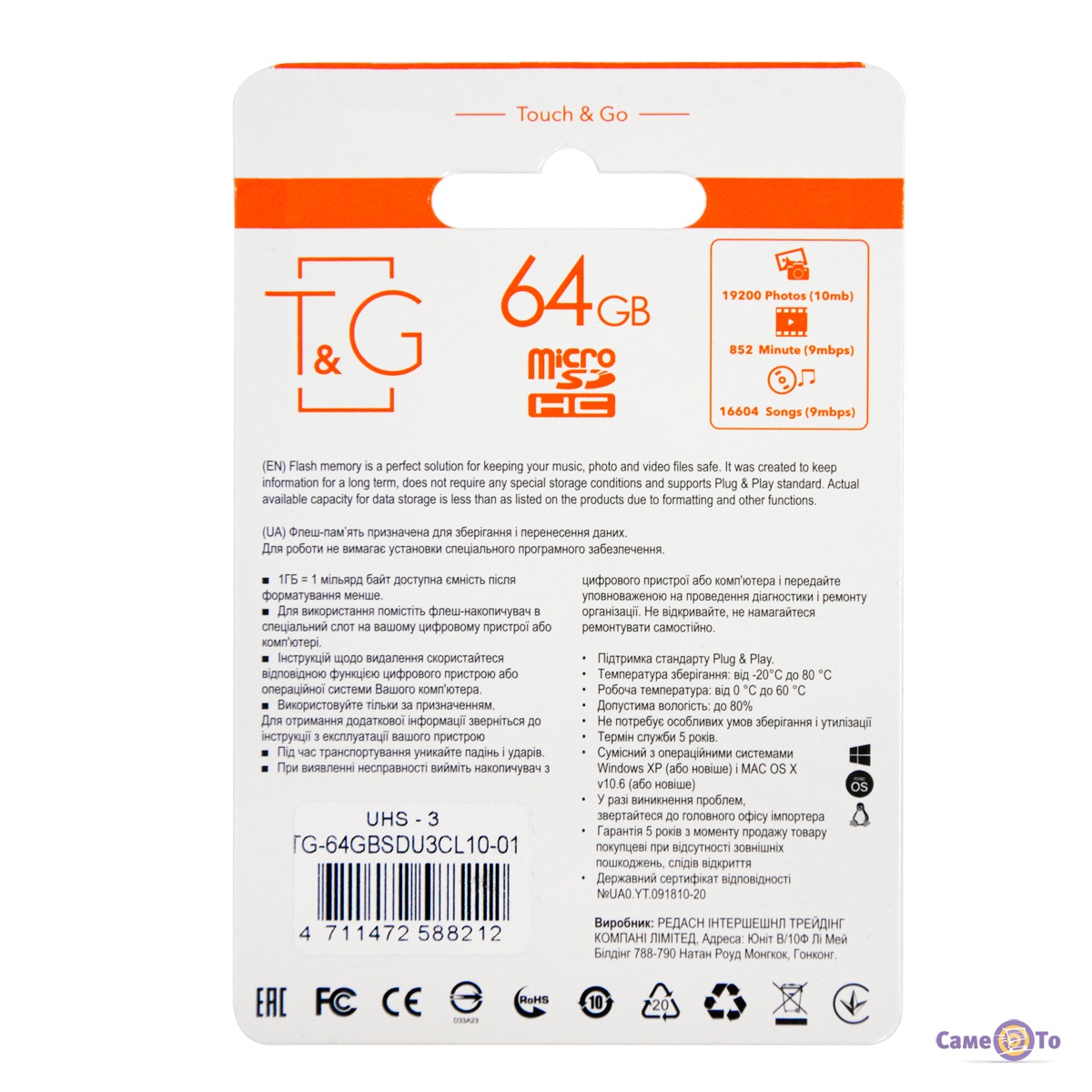 Карта пам'яті micro sd T&G 64 Гб Class 10 UHS-3 з адаптером - чудовий вибір для тих, хто шукає високоякісну карту пам'яті з великою місткістю та швидкою швидкістю передачі даних.