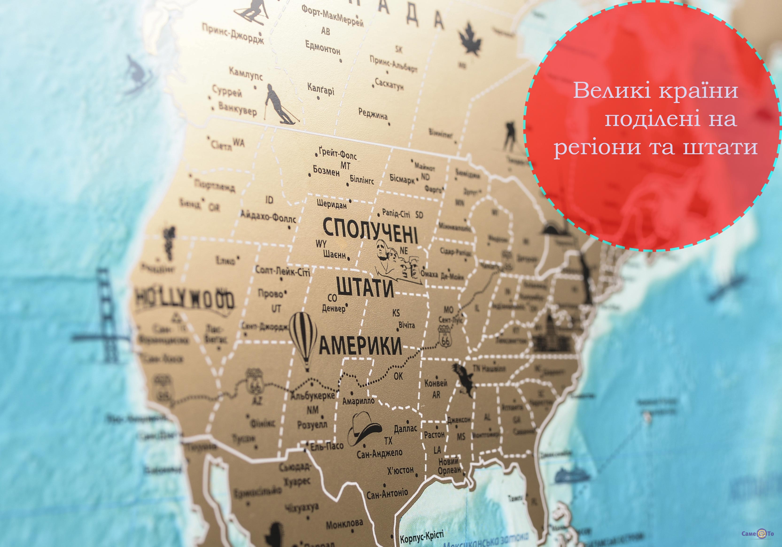 Карта доступна українською, російською та англійською мовами. Вона має високу якість. Вона надрукована на щільному ламінованої папері, покрита золотистим металізованим скретч шаром. Має оригінальний дизайн. Її зручно зберігати в тубусі. Подорожуйте по всьому світу і затирайте країни, які ви відвідали. Позначайте і плануйте свої пригоди. Завдяки рельєфу карти можна відзначити річки, вершини і ті відомі місця, в яких ви побували. На скретч карті світу є поле із прапорами, які ви можете стирати після того, як побували в тій чи іншій країні. За допомогою маркеру, що йде в наборі з картою, дуже легко планувати подорож та робити важливі помітки.
