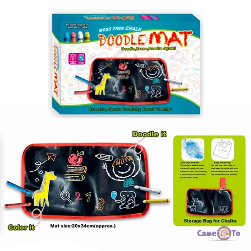 Килимок для малювання крейдою Doodle Mat має маленький розмір: 34 х 20 см. Виконаний атрибут для розвитку творчості з якісного поліестеру чорного кольору з червоною окантовкою. У набір для малювання входять чотири крейди, спеціальний в'яжучий склад яких, перешкоджає їх розшаруванню і не дає кришитися. Килимок для малювання Doodle Mat має спеціальний чохол для зберігання крейди. Це робить можливим їх акуратне зберігання спільно з самим атрибутом для малювання.