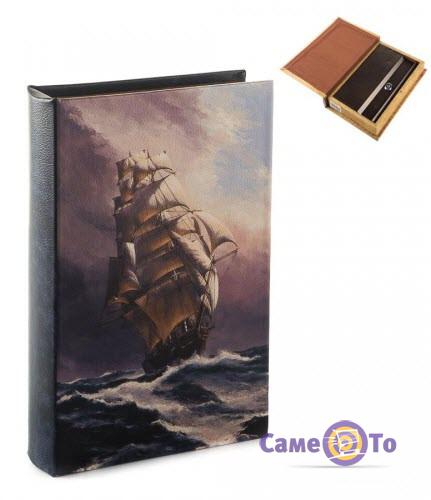 Сверху книга-сейф обтянута эко-кожей. Так что внешне она ничем не отличается от качественного дорогого печатного издания в твёрдом переплёте. Если Вы поставите её на полку между других книг, то она не будет бросаться в глаза.
