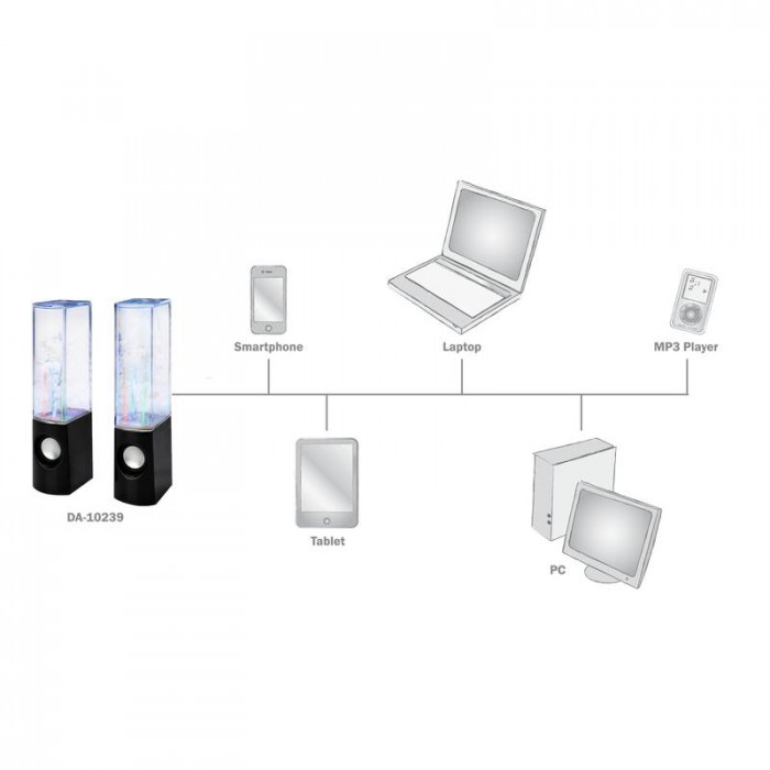 Колонки dancing water, при бажанні, можна підключити до смартфону, комп'ютера або телевізора, так як вони не потребують наявності яких небудь додаткових драйверів. Крім усього цього, їх можна використовувати як красивий нічник для спальні.