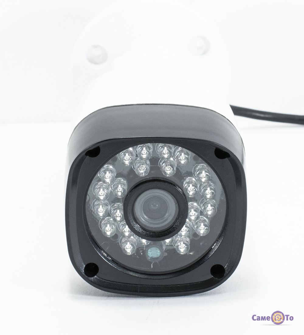 Камери підключаються до реєстратора за допомогою кабелю, що гарантує якість і чіткість зображення. IP-камери мають дозвіл HD, 720 пікселів. Стандарт стиснення відео Н.264. Це ліцензований стандарт стиснення, що забезпечує високу ступінь стиснення відеопотоку при збереженні його високої якості. Довжина дроту кожної з камер становить 14 метрів. Живлення відбувається від мережі 220 V. Робота камери ідентифікується інфрачервоним підсвічуванням.